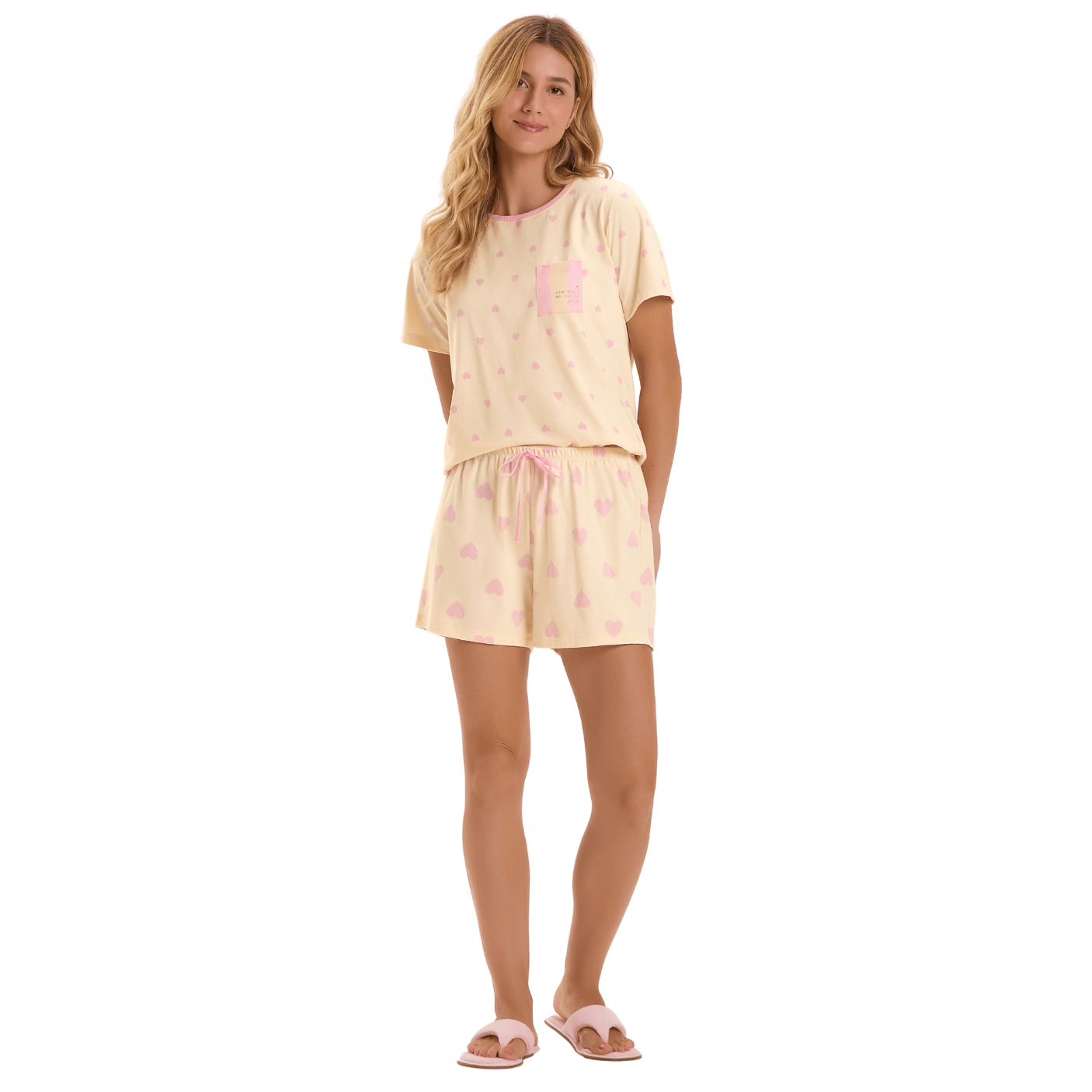 O Pijama Curto Leve Amarelo Corações Cor Com Amor combina leveza, frescor e romantismo para proporcionar noites ainda mais confortáveis. Com uma paleta suave em amarelo pastel e estampa delicada de corações rosa, o conjunto traz aquele visual aconchegante e feminino que conquista de imediato.