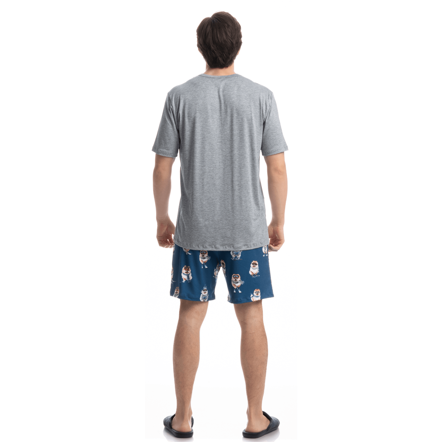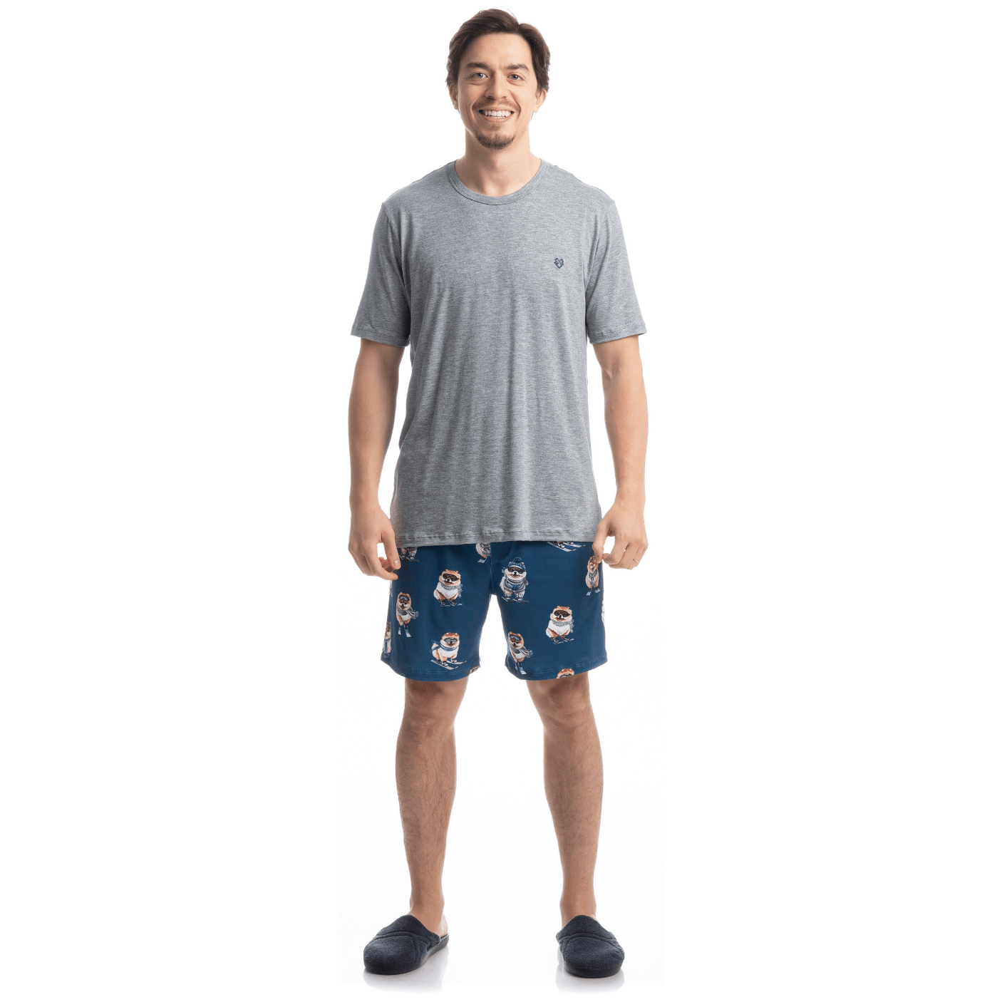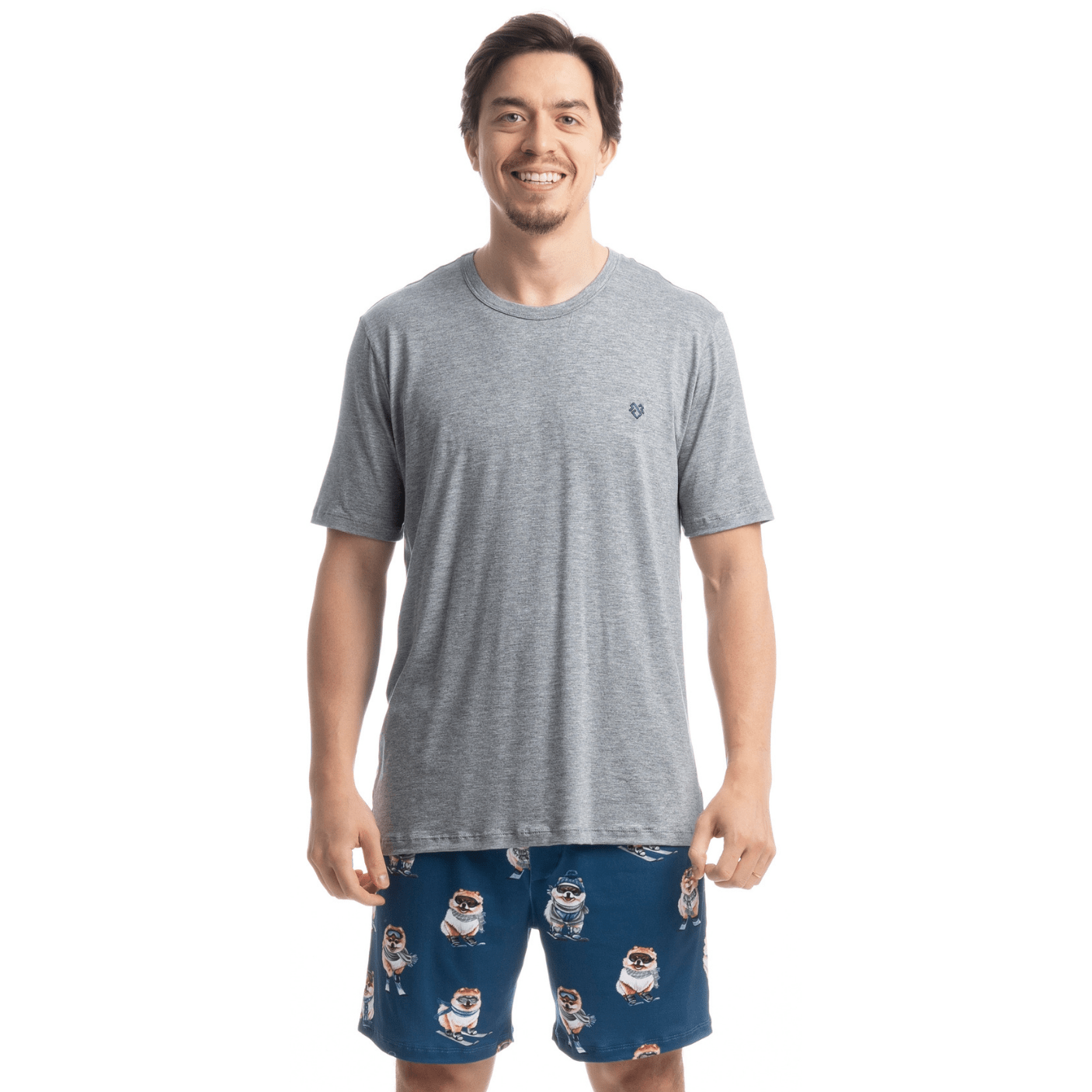 Pijama Masculino Curto Lyla Ski é puro conforto e estilo! Sua blusa possui decote redondo com acabamento em viés. Detalhe para sua etiqueta personalizada na lateral inferior esquerda. Já seu short estampado, conta com elástico macio no cós proporcionando muito conforto em suas horas de descanso. A escolha perfeita para os dias mais quentes! Sua blusa, confeccionada em Viscolycra Mescla, tecido proveniente da fusão da fibra de elastano com o fio de viscose, gerando um tecido leve e confortável de fácil cuidado. É uma das principais bases usadas em nossa marca por sua maciez e conforto. Seu short, confeccionado em Skin Touch, tecido extremamente macio. Seu toque aconchegante proporciona conforto térmico e uma sutil sensação de bem-estar. A combinação de poliéster com o elastano garante durabilidade e praticidade no seu dia a dia. ... José veste tamanho M