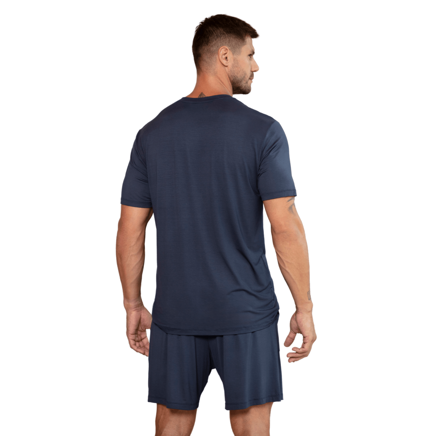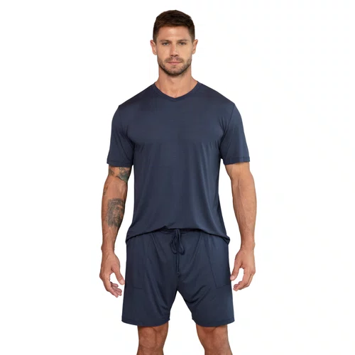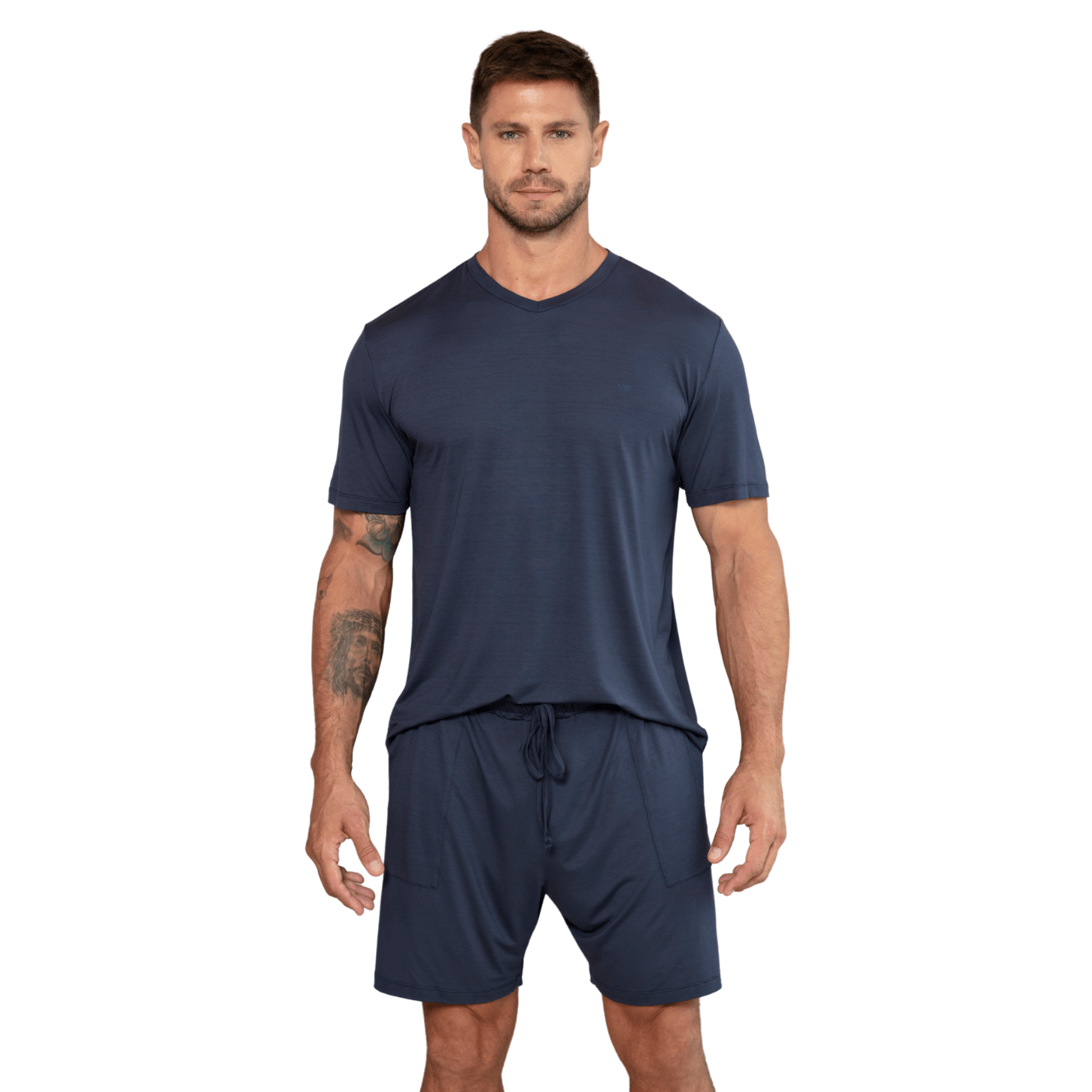 O design moderno combina camiseta com gola V, que proporciona um visual sofisticado e atemporal, com bermuda de caimento fluido e detalhe de pesponto contrastante, que adiciona um toque contemporâneo à peça. Cada detalhe foi pensado para garantir um pijama que une estilo e funcionalidade, com um acabamento que valoriza o corpo sem limitar os movimentos.