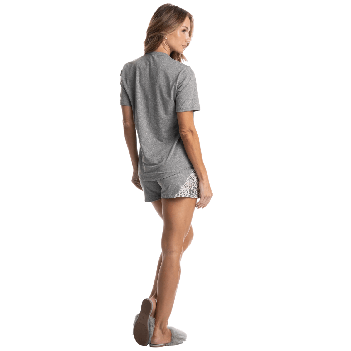 Com um design moderno e sofisticado, o conjunto se destaca pelos detalhes em renda, que trazem um toque feminino e refinado à peça. A cor mescla garante um visual neutro e elegante, ideal para quem valoriza estilo até na hora de relaxar.