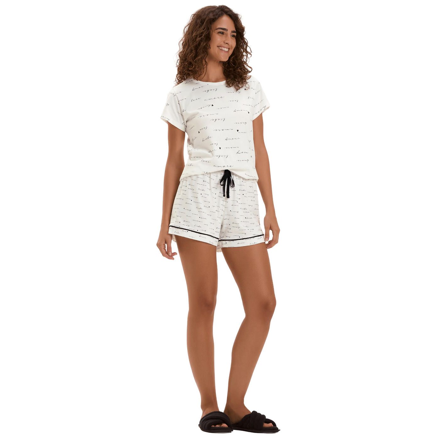 Confortável, delicado e cheio de charme! O Pijama Escritas Amore Branco da Cor Com Amor é a escolha perfeita para quem ama um homewear leve, romântico e estiloso. Com estampa de palavras como “Amore”, “Love”, “Lindo” e pequenos corações, ele transmite suavidade e fofura com um toque moderno.