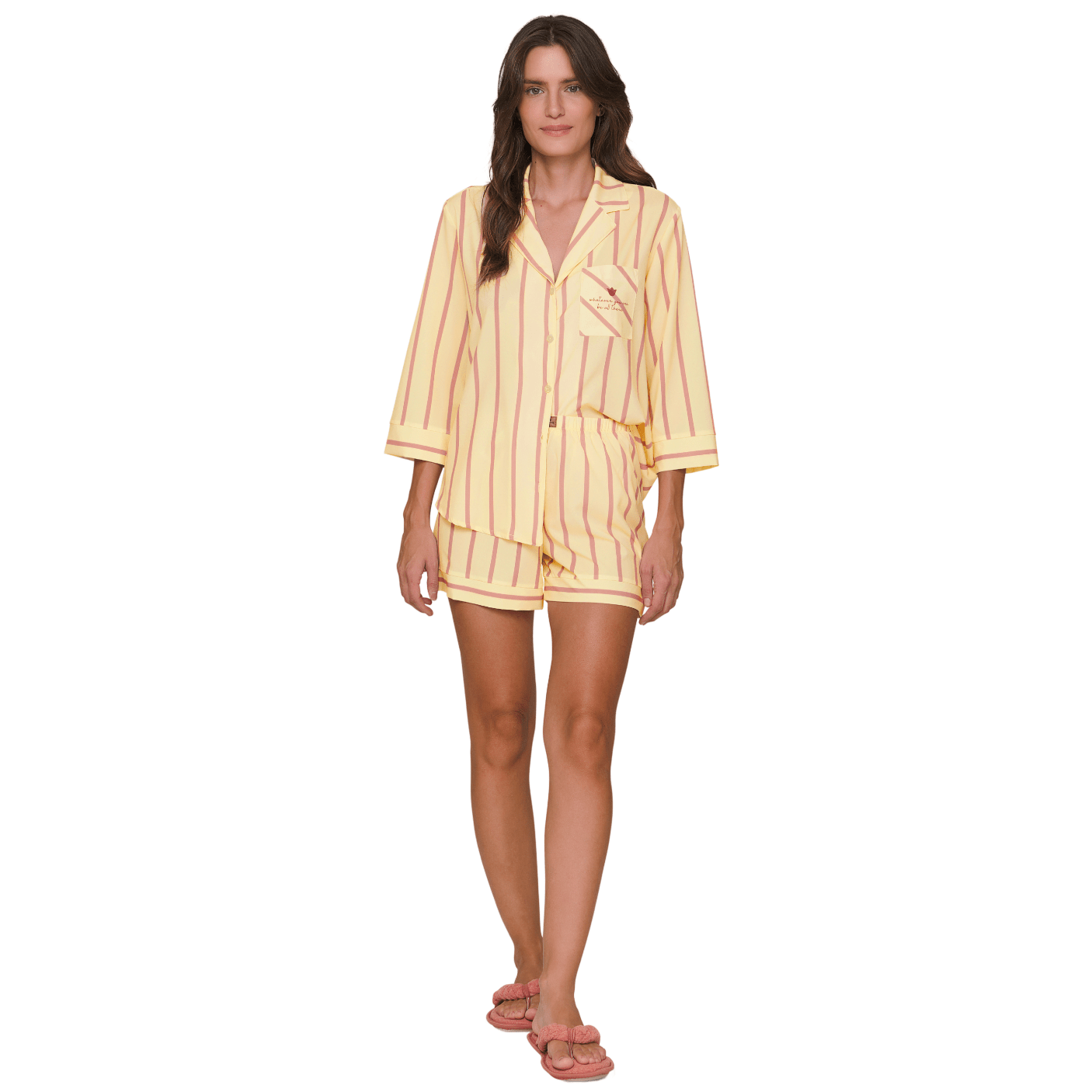 A camisa, em tom suave de amarelo com listras verticais em rosa claro, possui abertura frontal com botões personalizados, que facilitam o vestir e trazem sofisticação ao design. O bolso frontal com estampa delicada e acabamento refinado reforça o charme e a exclusividade da peça.