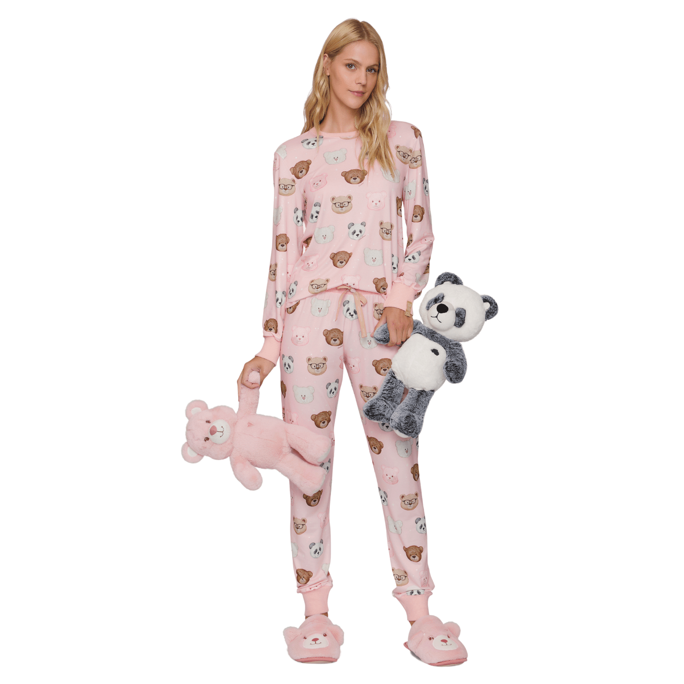 Os amigos ursos mostram a cara, literalmente, neste coordenado super querido e delicado. Tenha a companhia de Lulu, Ollie, Shadow, Nina e Steve e garanta um momento especial com essa família que é puro amor. Pijama jogger de manga longa confeccionado em sublime touch, uma malha com toque suave de pele de pêssego. A blusa apresenta gola e punhos com acabamento em ribana, proporcionando conforto extra. A calça, com modelagem jogger, possui cós em ribana com elástico interno, oferecendo segurança e ajuste perfeito. Recebe cordão e etiquetas exclusivos, dando aquele toque final à composição.