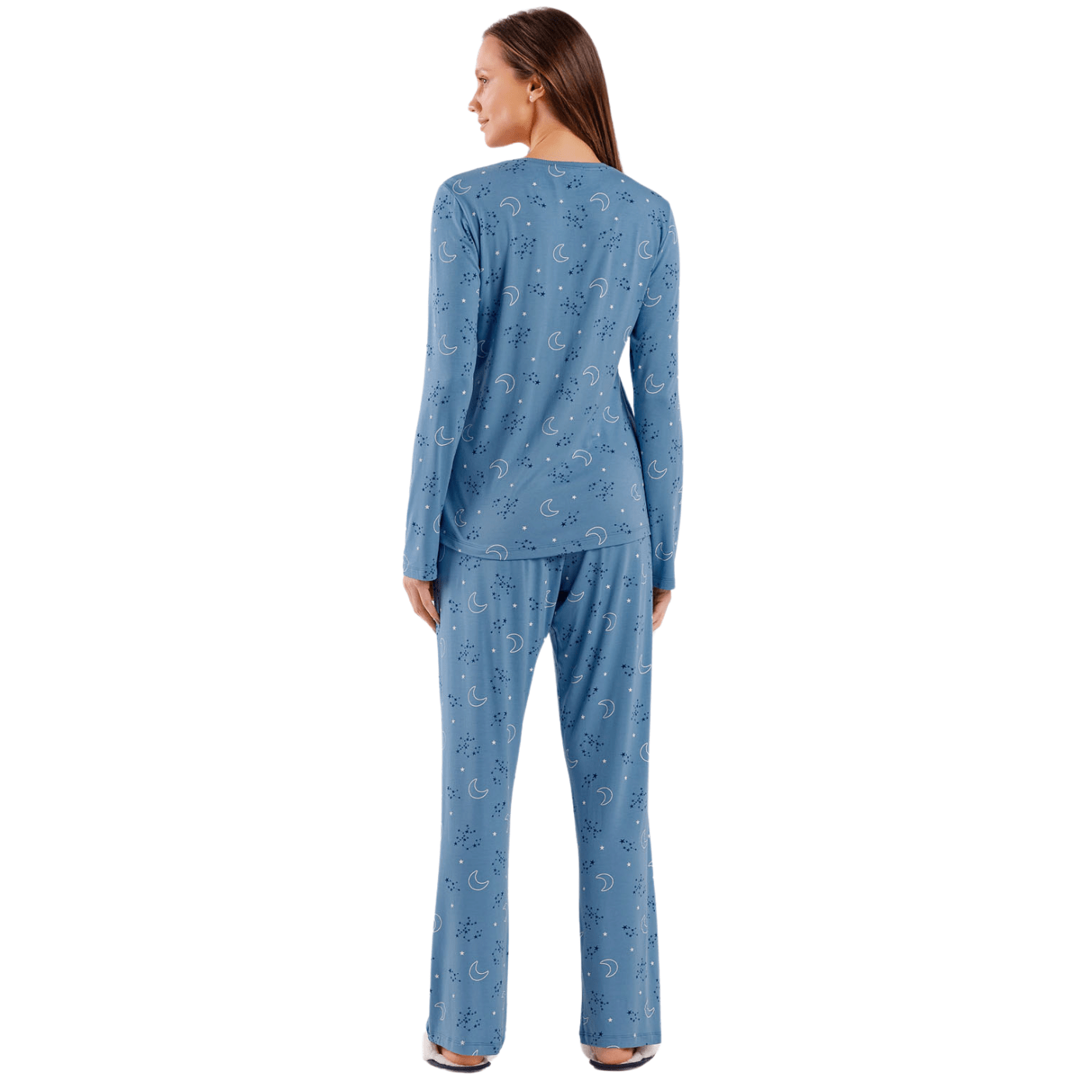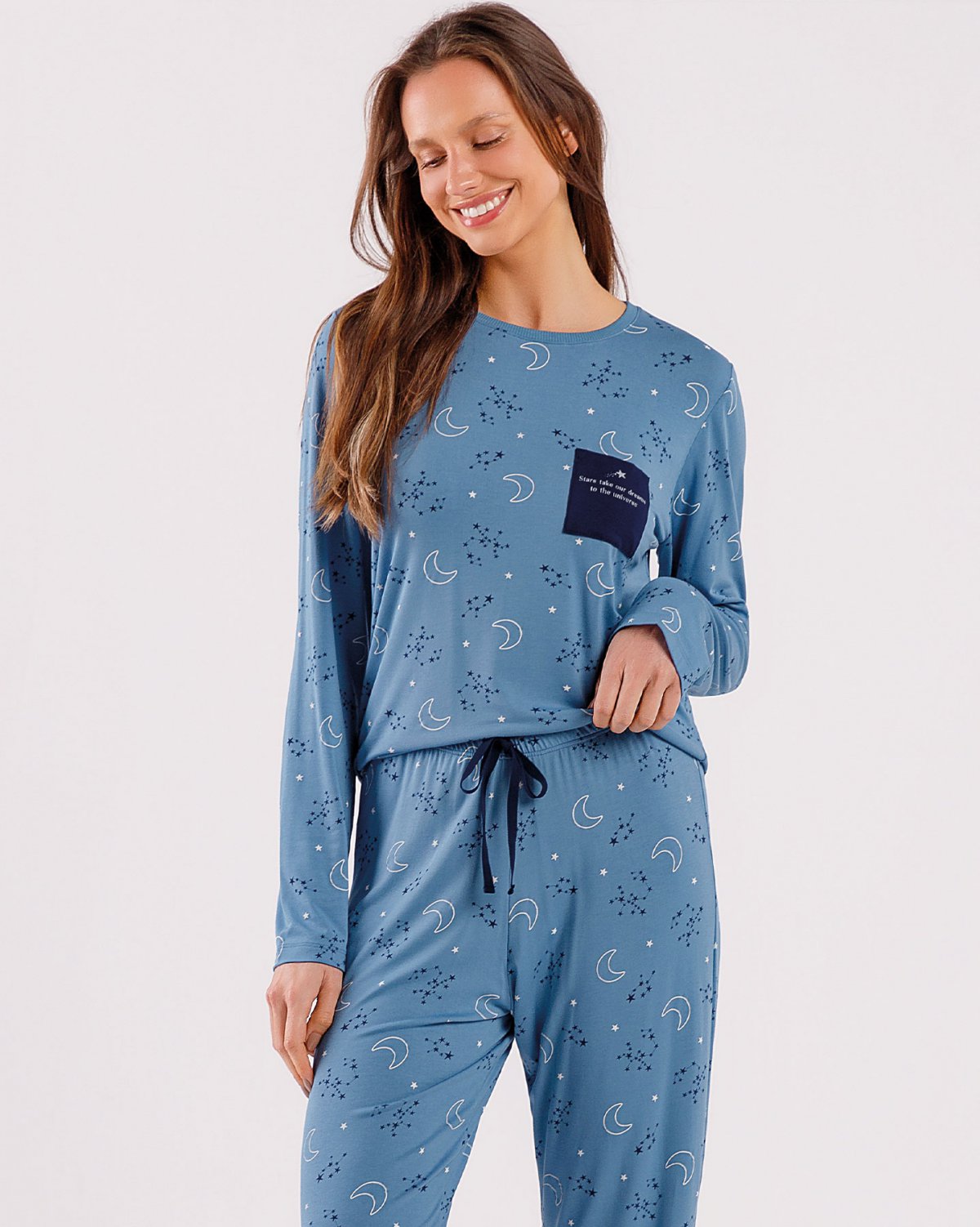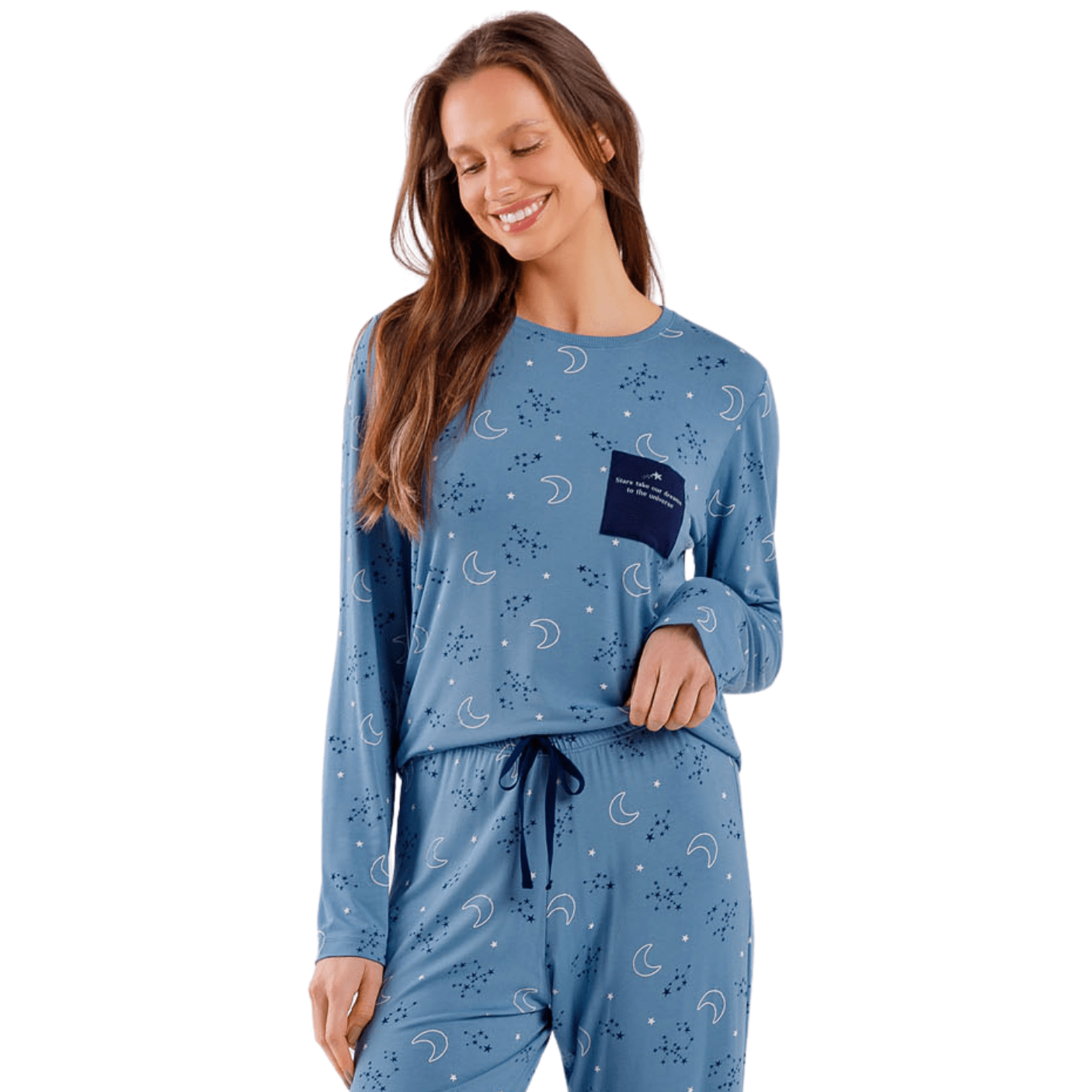 A estampa exclusiva do conjunto adiciona um toque de estilo único, enquanto o detalhe de bolso funcional estampado, com a frase inspiradora "Estrelas levam nossos sonhos para o universo", traz um toque poético e encantador, convidando a mente a viajar para os sonhos mais bonitos.