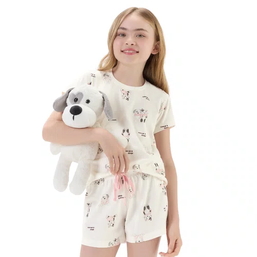 Confeccionado em malha macia e leve, o conjunto traz camiseta branca com estampa divertida de gatinhos e cachorrinhos, combinada com short confortável com elástico na cintura e detalhe em cordão delicado.