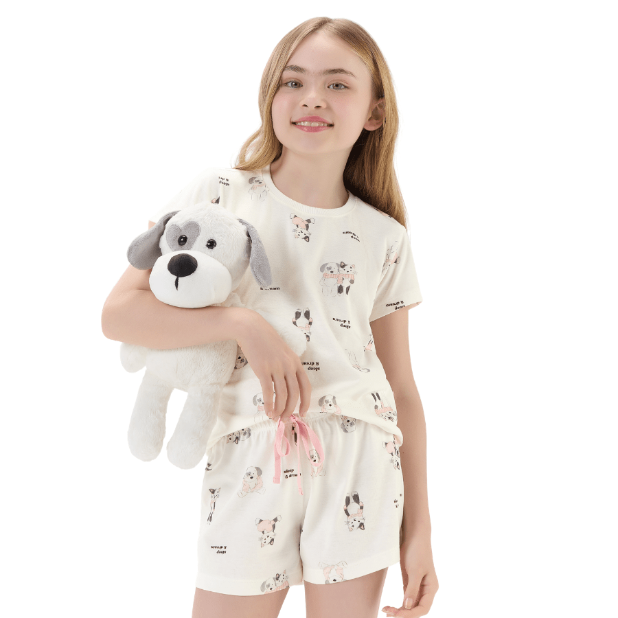 O Pijama Infantil Curto Branco Cat e Dog Cute Cor com Amor é perfeito para noites cheias de conforto e delicadeza.