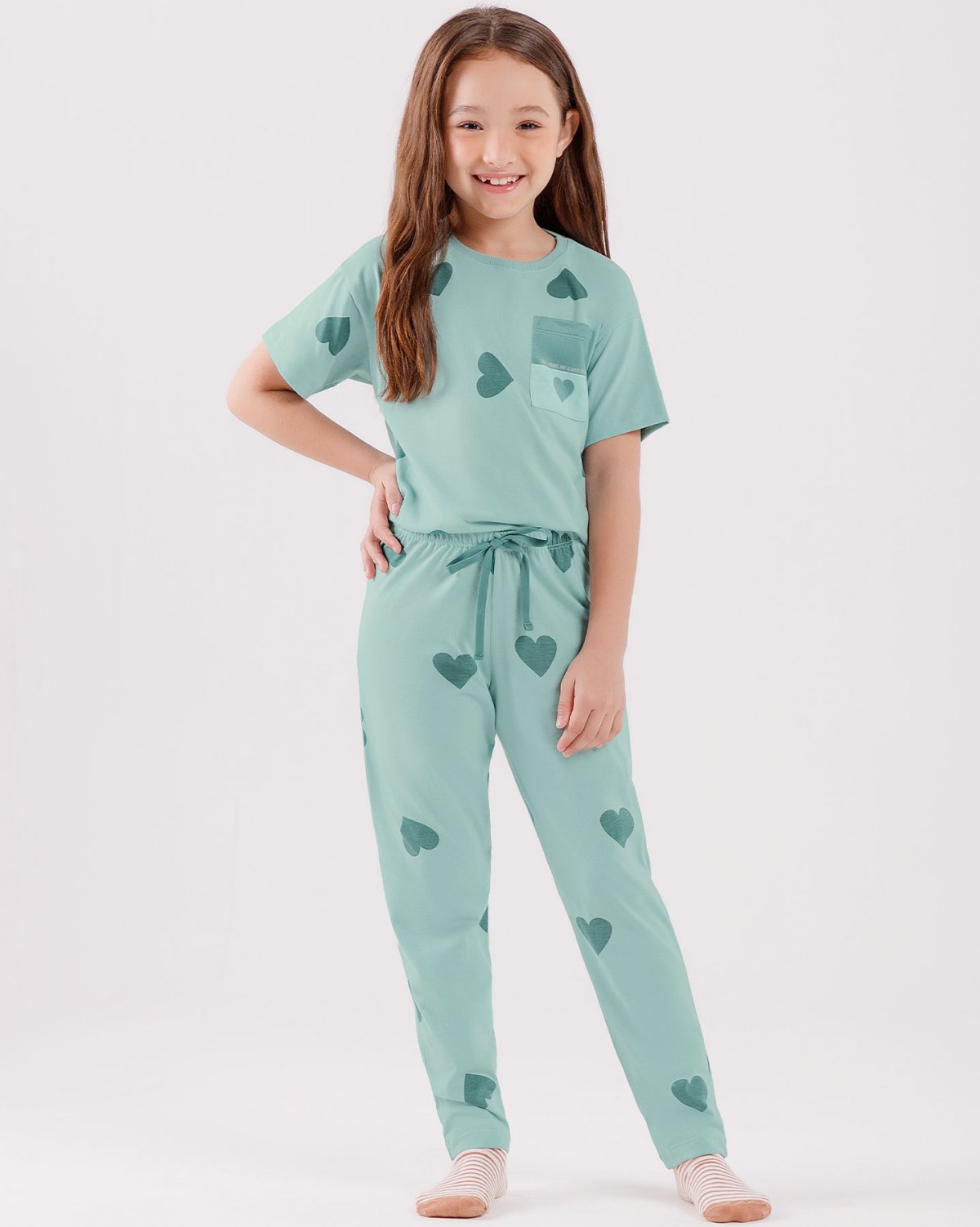 O Pijama Feminino Manga Curta com Calça é uma peça que combina sofisticação, conforto e um toque de charme, perfeito para momentos de tranquilidade. Confeccionado em malha 100% algodão, o conjunto traz uma estampa delicada de corações em verde escuro, que adiciona um visual moderno e encantador à peça.