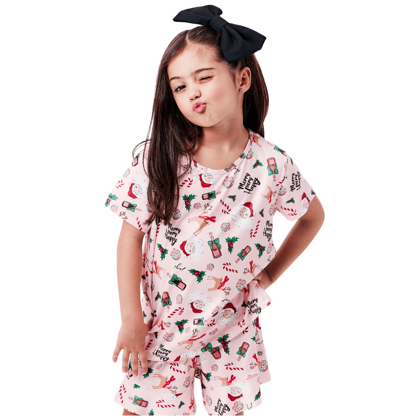 A estampa exclusiva Natal Hohoho traz elementos clássicos e encantadores do Natal, como Papai Noel, doces, laços e frases natalinas, criando um visual lúdico, alegre e cheio de personalidade. A paleta em tom rosa suave deixa o conjunto ainda mais delicado e encantador, perfeito para as pequenas entrarem no clima natalino com muito estilo.