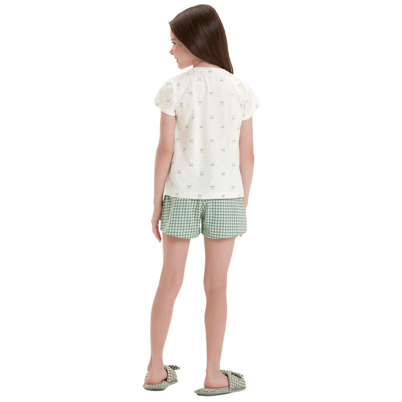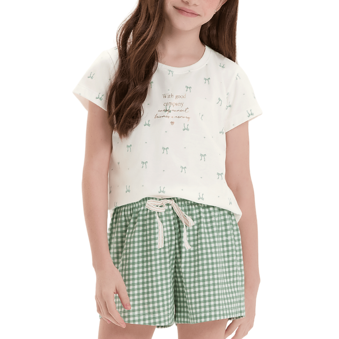 O short em estampa vichy verde completa o conjunto com muito estilo. Além de lindo, é super confortável graças ao cós com elástico e amarração ajustável, garantindo liberdade para brincar, dormir e relaxar.