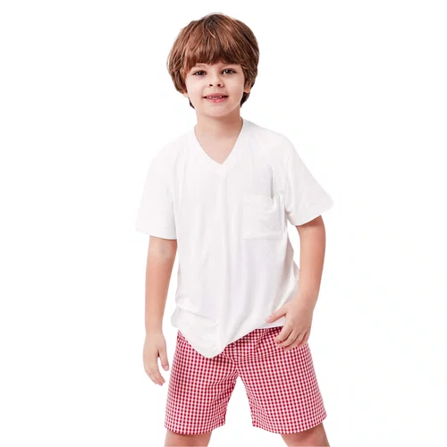 O conjunto é composto por camiseta de manga curta em tom neutro, com modelagem confortável e caimento leve, e short estampado em xadrez vermelho, garantindo liberdade de movimentos para brincar, descansar e dormir com conforto. Confeccionado em tecido macio e agradável ao toque, é ideal para a pele delicada das crianças, proporcionando bem-estar durante toda a noite.
