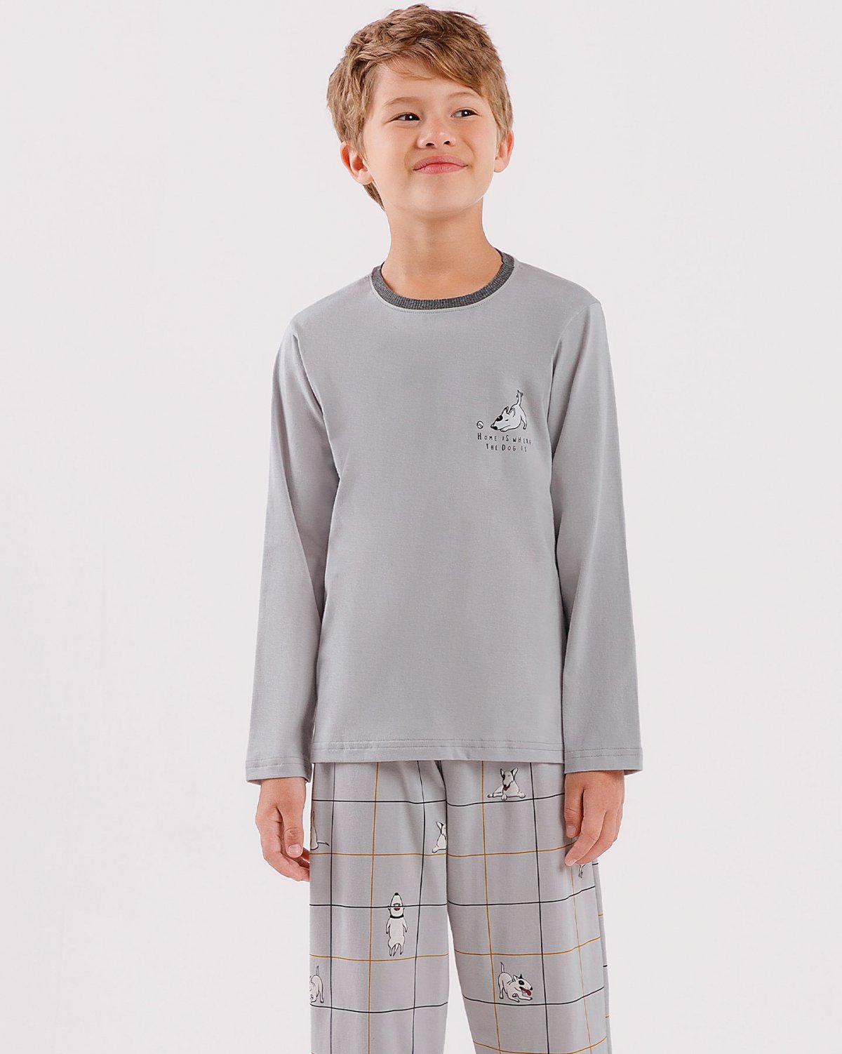 A calça traz uma estampa xadrez discreta com um charme irresistível: detalhes de cachorrinhos brincando sobre o xadrez, criando um visual divertido e cheio de personalidade. Já a blusa de manga longa equilibra o look com conforto e praticidade.