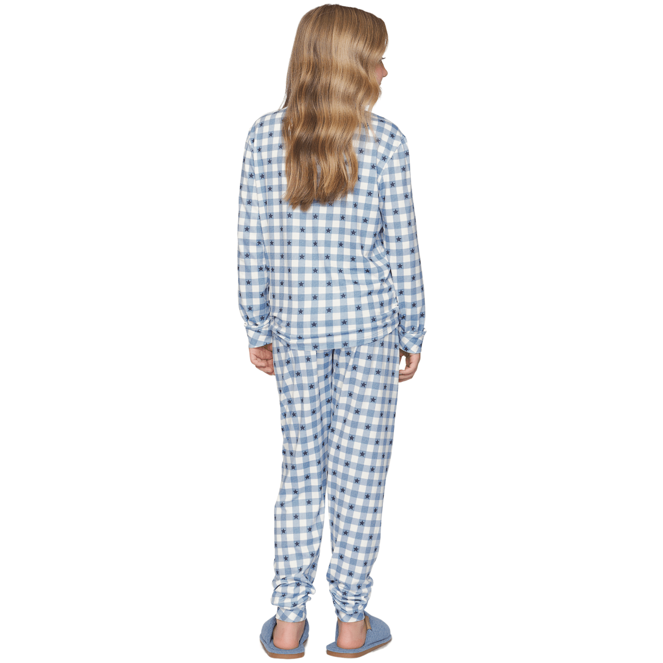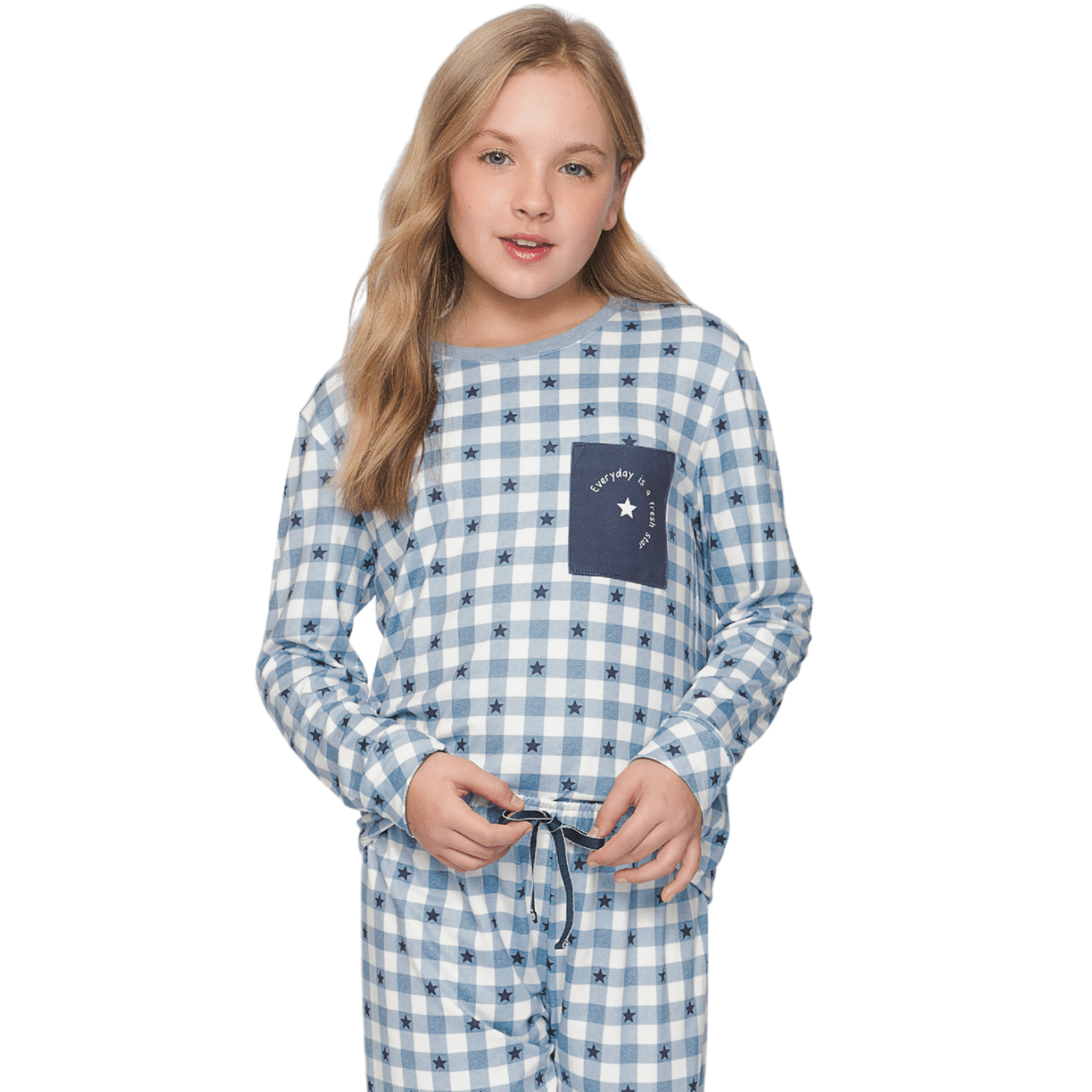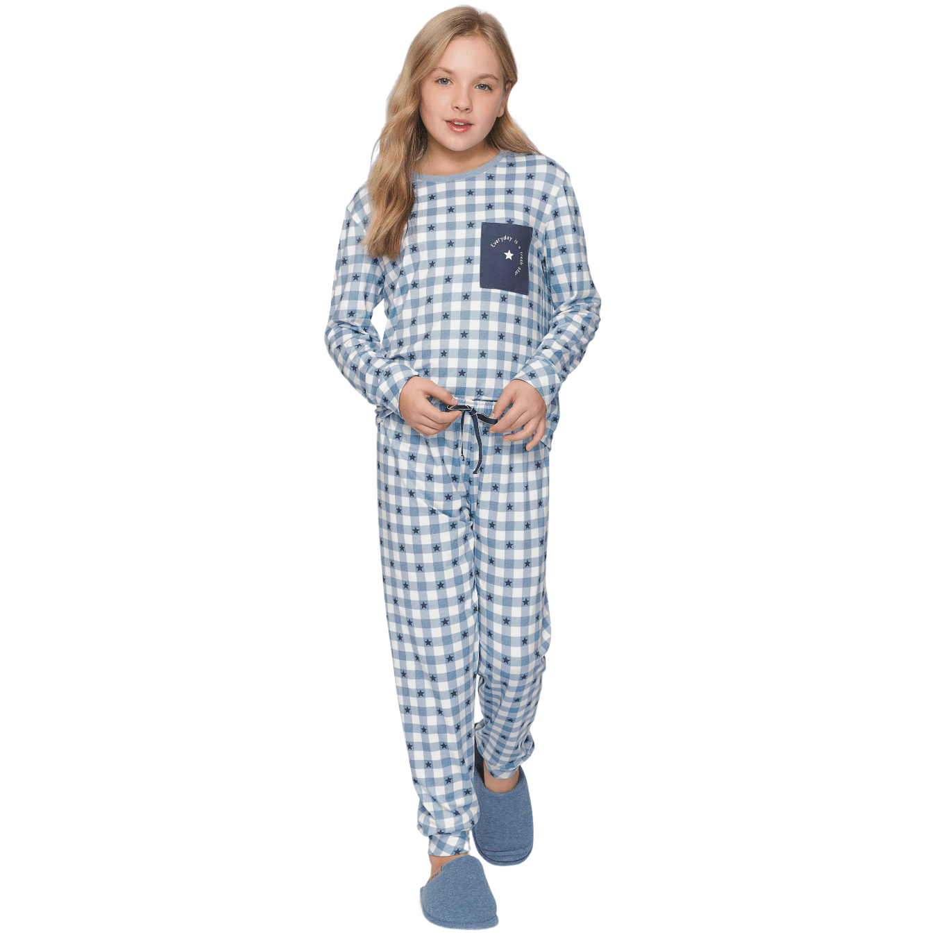 A blusa de manga longa apresenta um bolso frontal com estampa moderna, que dá um toque divertido e atual à peça. Esse detalhe não apenas complementa o design, mas também adiciona personalidade ao look dos pequenos, tornando o momento de vestir o pijama algo ainda mais especial.