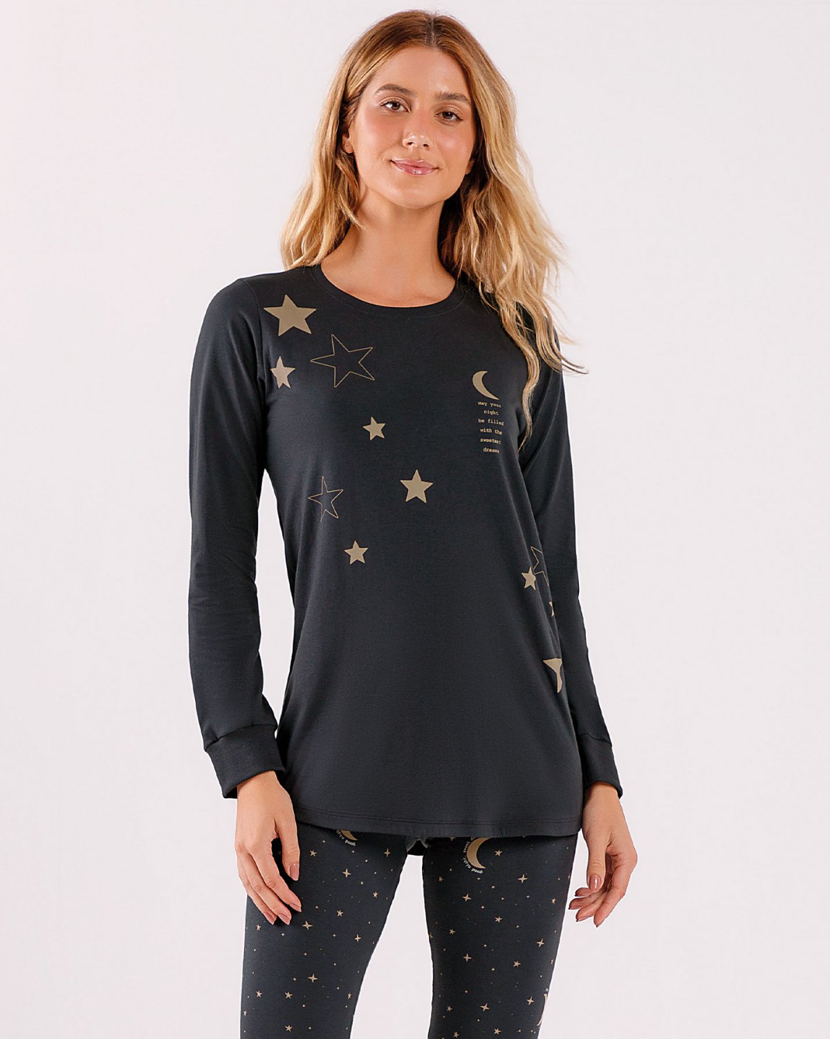 O destaque da blusa fica por conta da estampa localizada, pensada para trazer um toque de personalidade e atitude ao look. Seja com frases inspiradoras, ilustrações delicadas ou desenhos criativos, ela dá o charme necessário para fazer desse pijama muito mais do que uma roupa de dormir – é um verdadeiro reflexo do seu estilo mesmo nos momentos mais íntimos e relaxantes.