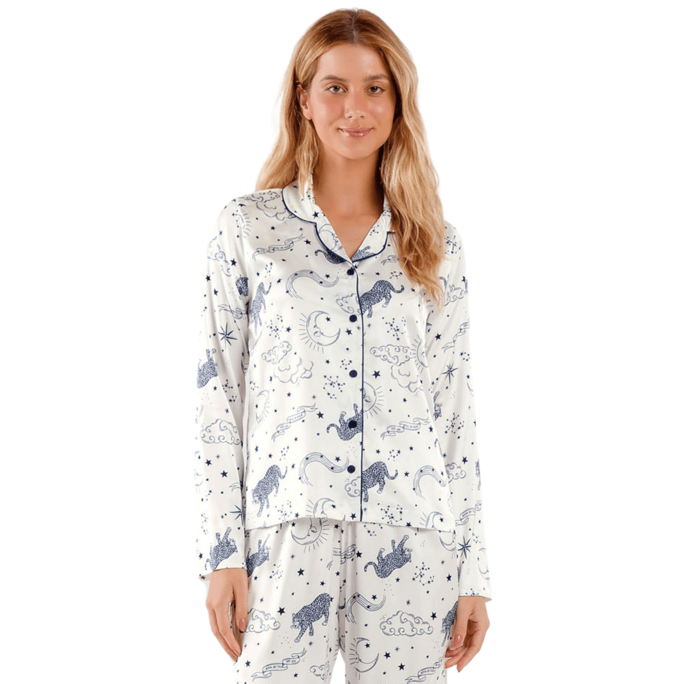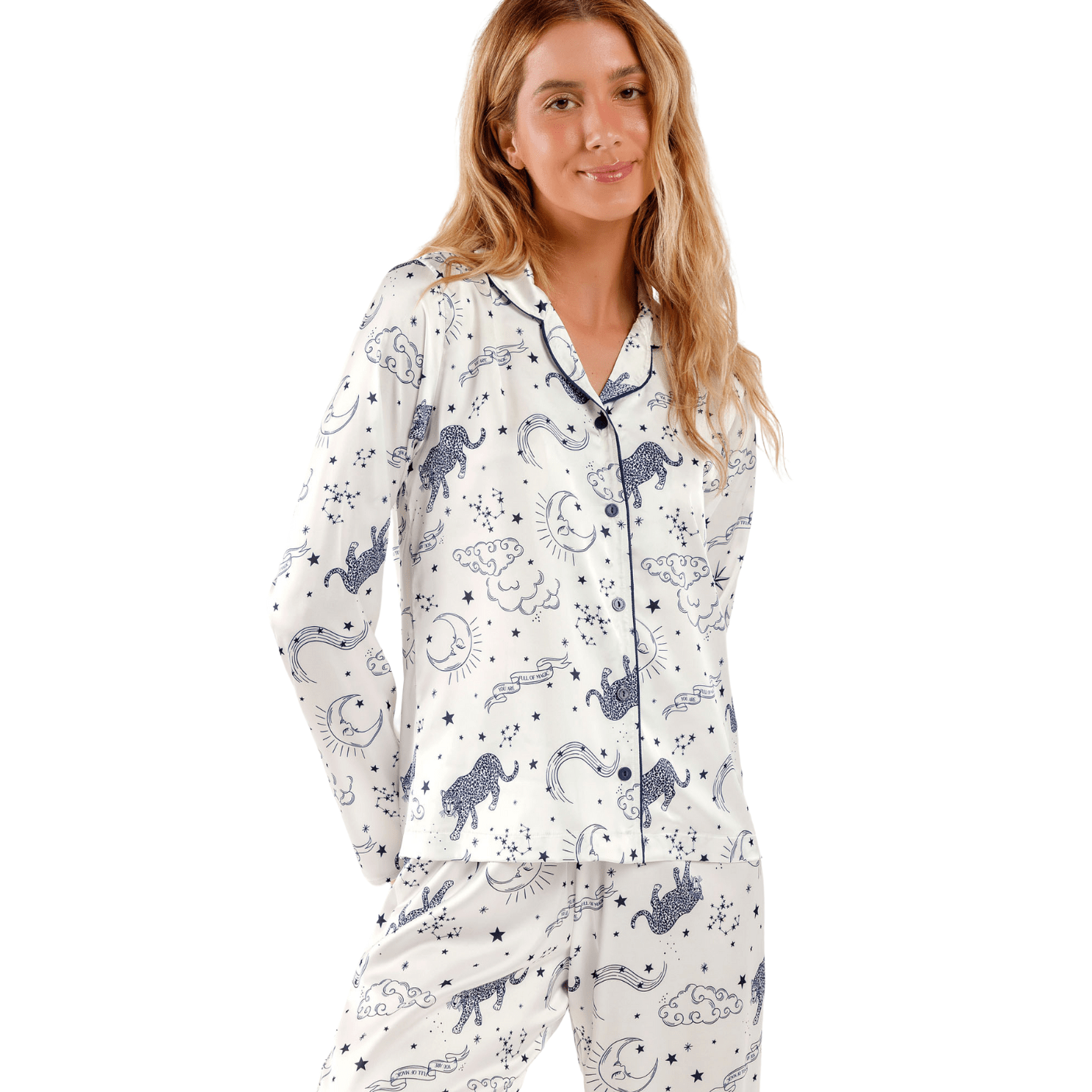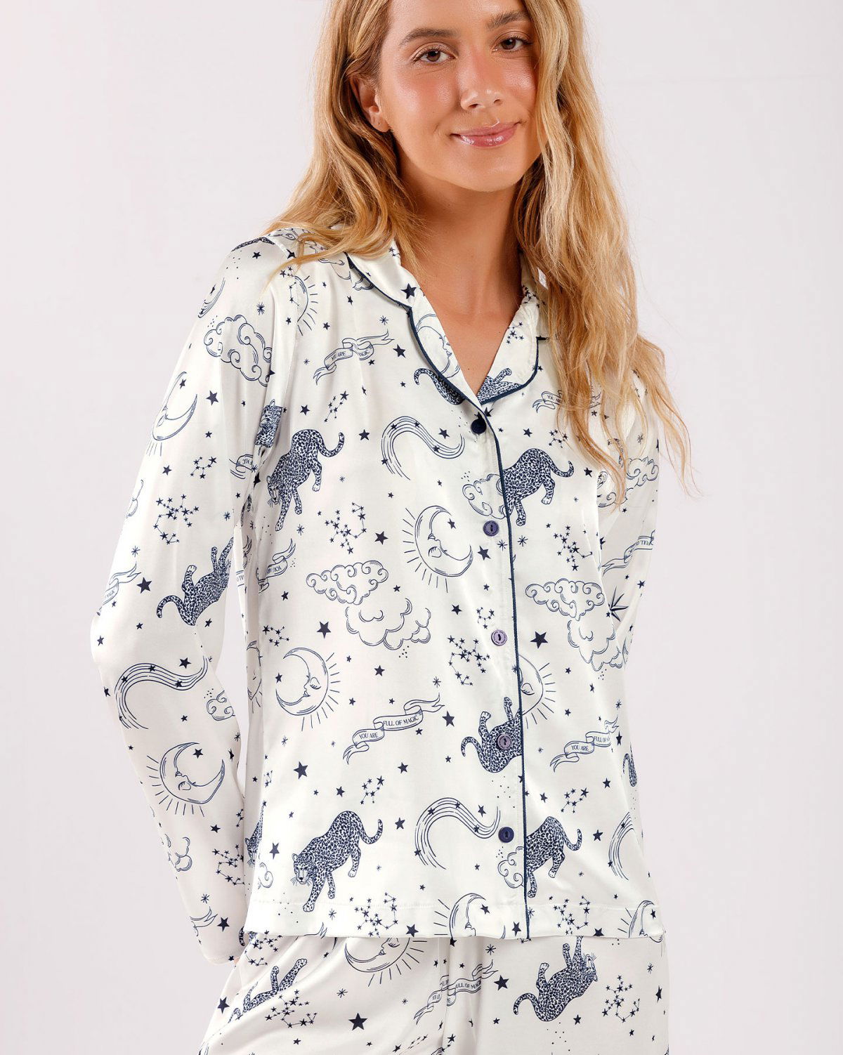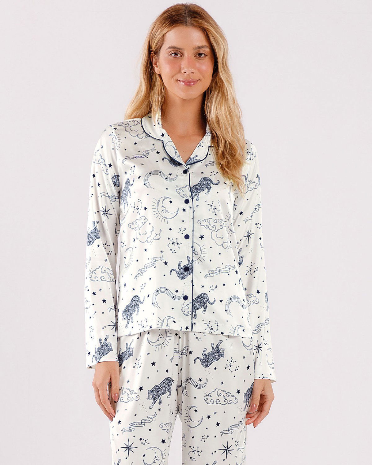 Elegância e conforto em cada detalhe – Pijama Feminino Manga Longa Acetinado com Abertura e Estampa Exclusiva