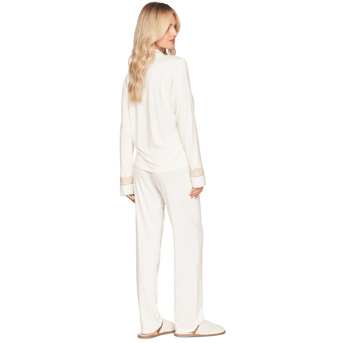Confeccionado em tecido leve, fluido e extremamente macio, o conjunto proporciona um caimento suave e confortável sobre o corpo. A camisa de manga longa possui abertura frontal com botões e gola clássica, criando um visual refinado e atemporal. Os detalhes delicados nos punhos elevam o acabamento com um toque sutil de sofisticação.