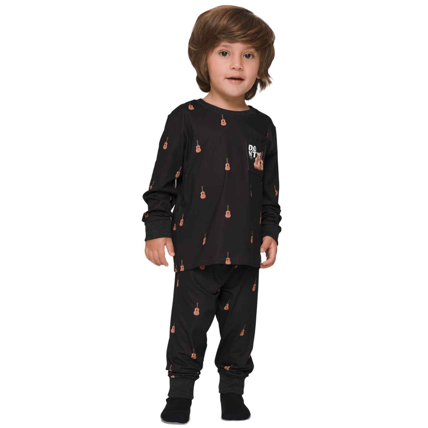 | • Acabamento | Blusa com acabamentos de gola feito em tecido de ribana, Calça com elástico na cintura |