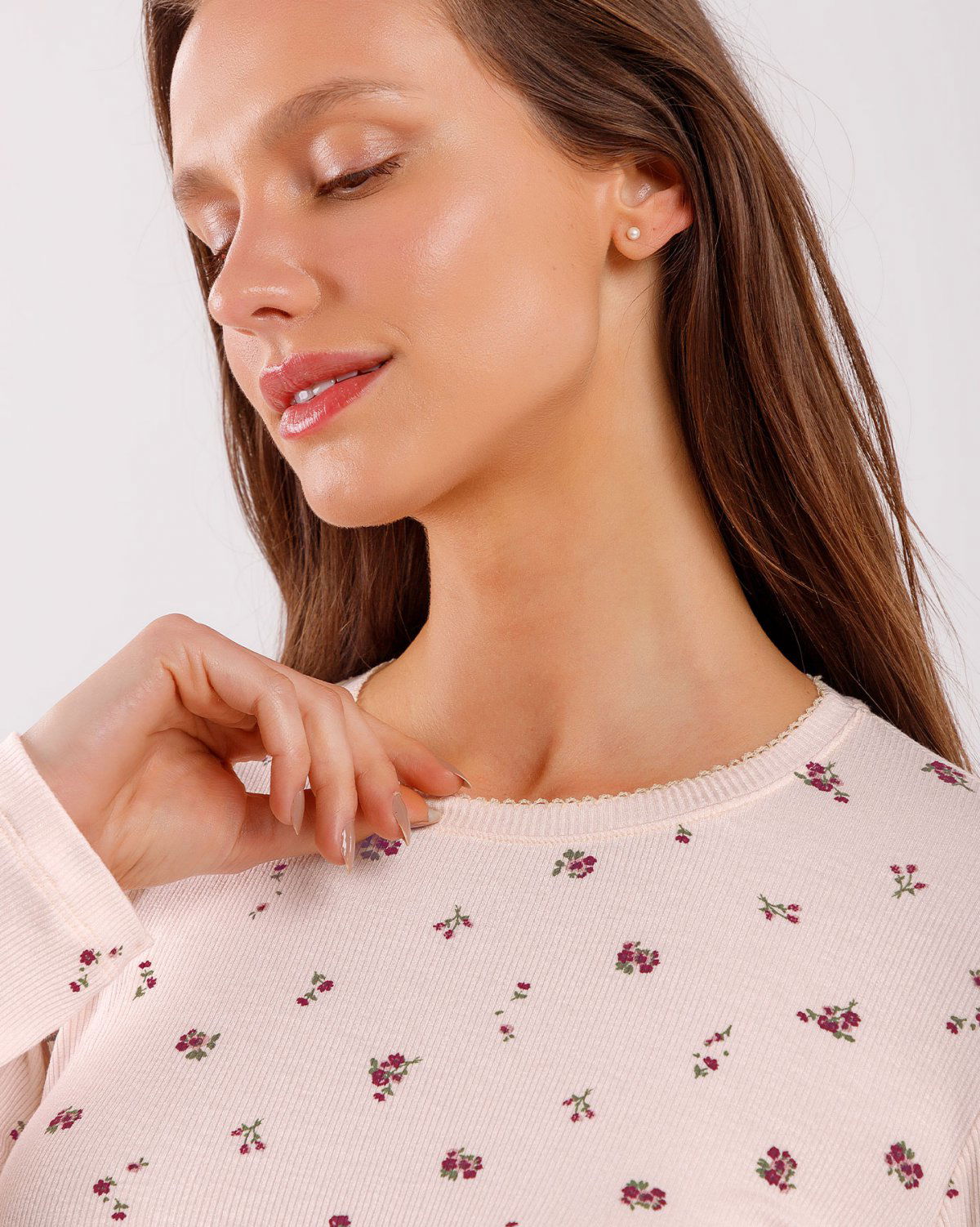 A estampa floral delicada espalha-se com suavidade pela peça, trazendo frescor, feminilidade e leveza. Cada flor parece contar uma história de tranquilidade e beleza, compondo um look que convida ao relaxamento e aos pequenos prazeres da rotina noturna.