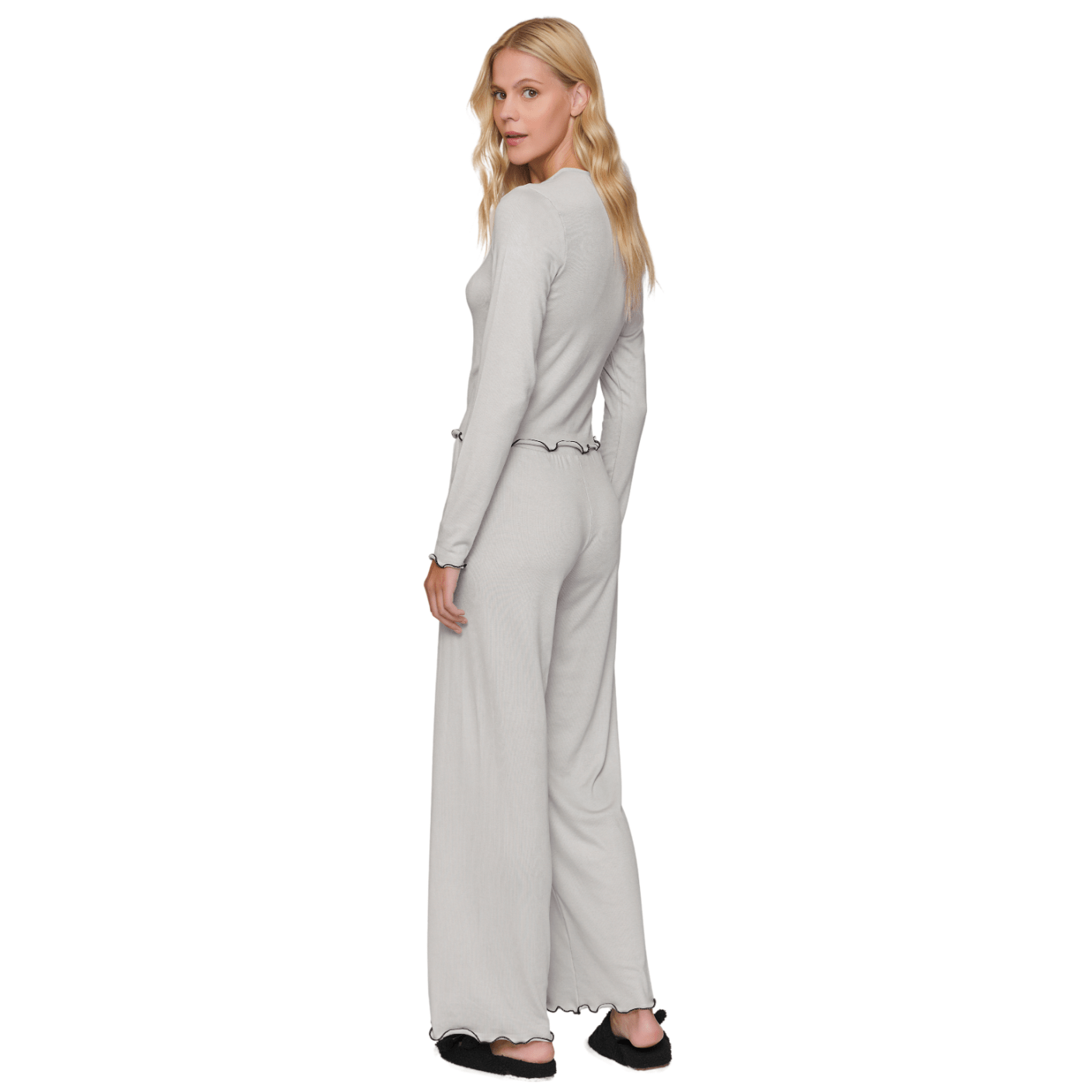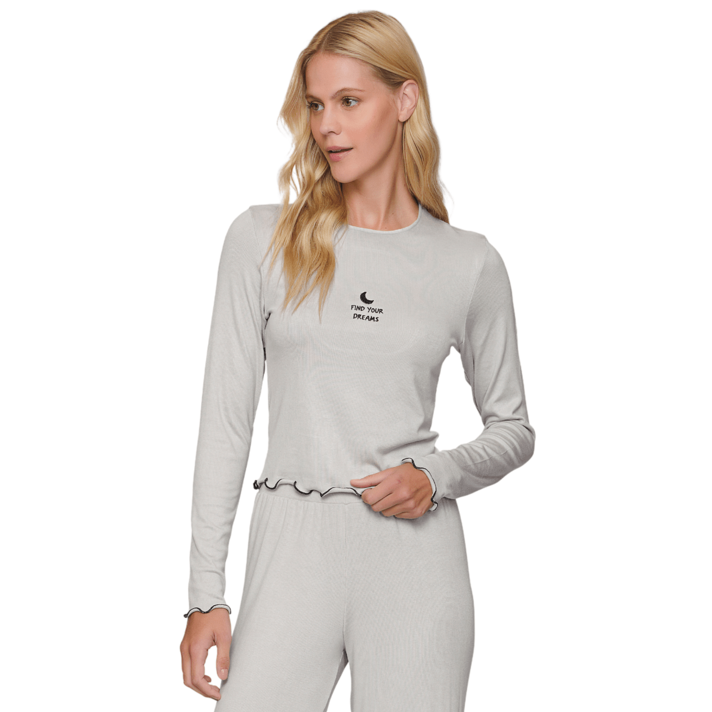 Confeccionado em canelado modal — uma malha de toque ultra macio, respirável e com leve elasticidade — este pijama é a escolha ideal para quem busca aconchego com elegância, seja para uma noite tranquila ou para momentos de autocuidado durante o dia.