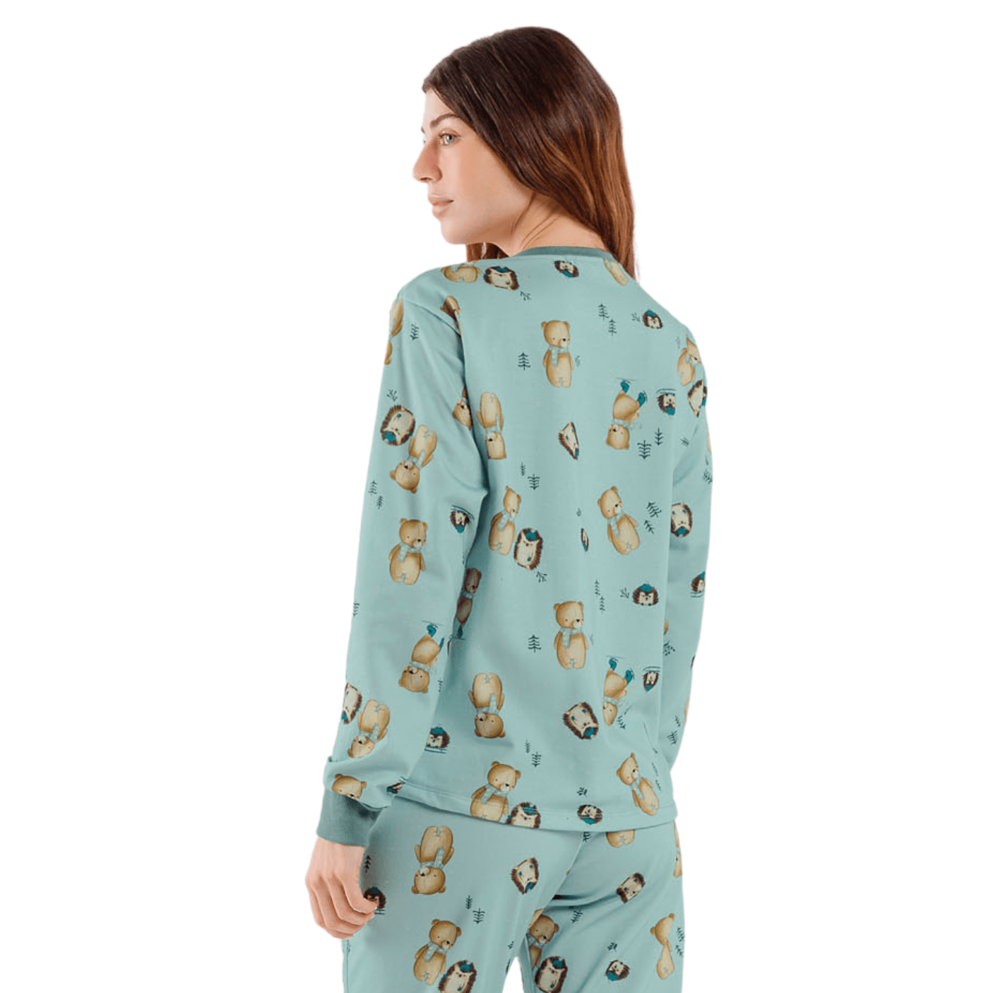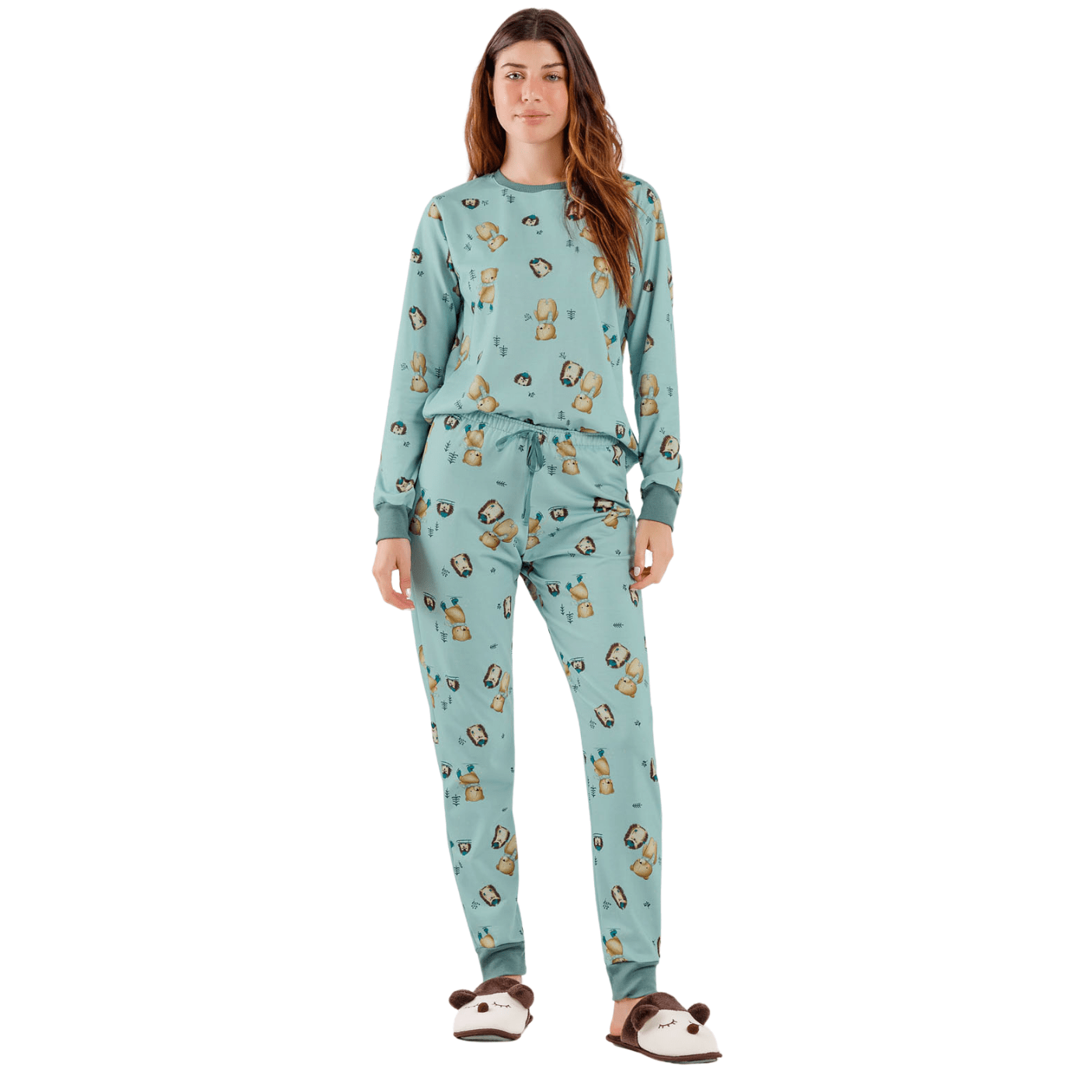 Perfeito para noites de puro aconchego, esse pijama combina conforto e delicadeza em um design encantador. Confeccionado em malha de moletinho com felpa na cor verde, ele oferece um toque macio e quentinho, ideal para os dias mais frios. ❄️