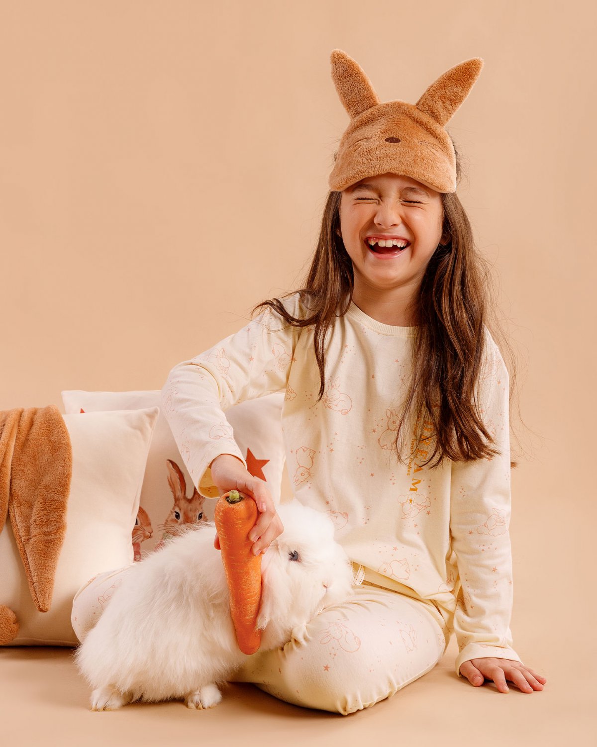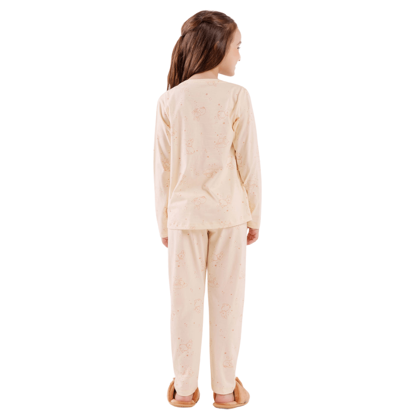 Feito para envolver em aconchego e delicadeza, este pijama é confeccionado em malha 100% algodão, garantindo um toque macio e respirável para noites tranquilas. Sua tonalidade pérola serve como pano de fundo para uma encantadora estampa de coelhinhos adormecidos e estrelas em um suave tom salmão, criando um visual lúdico e acolhedor.