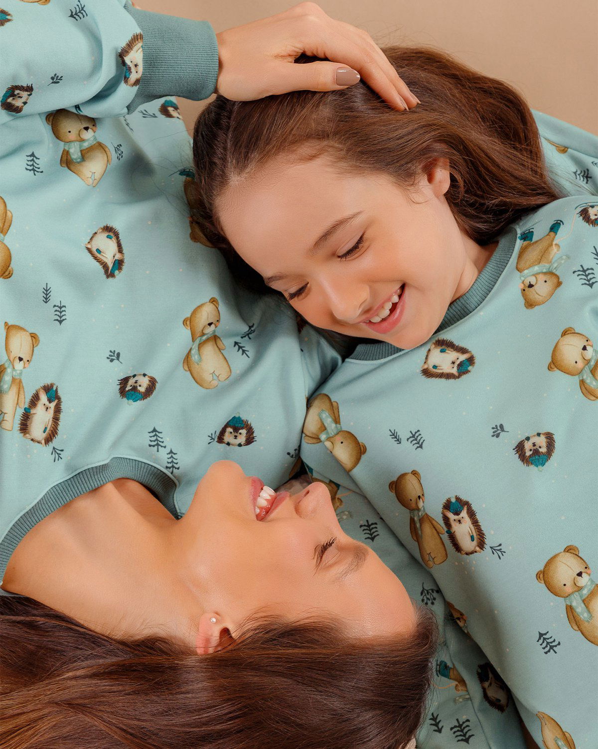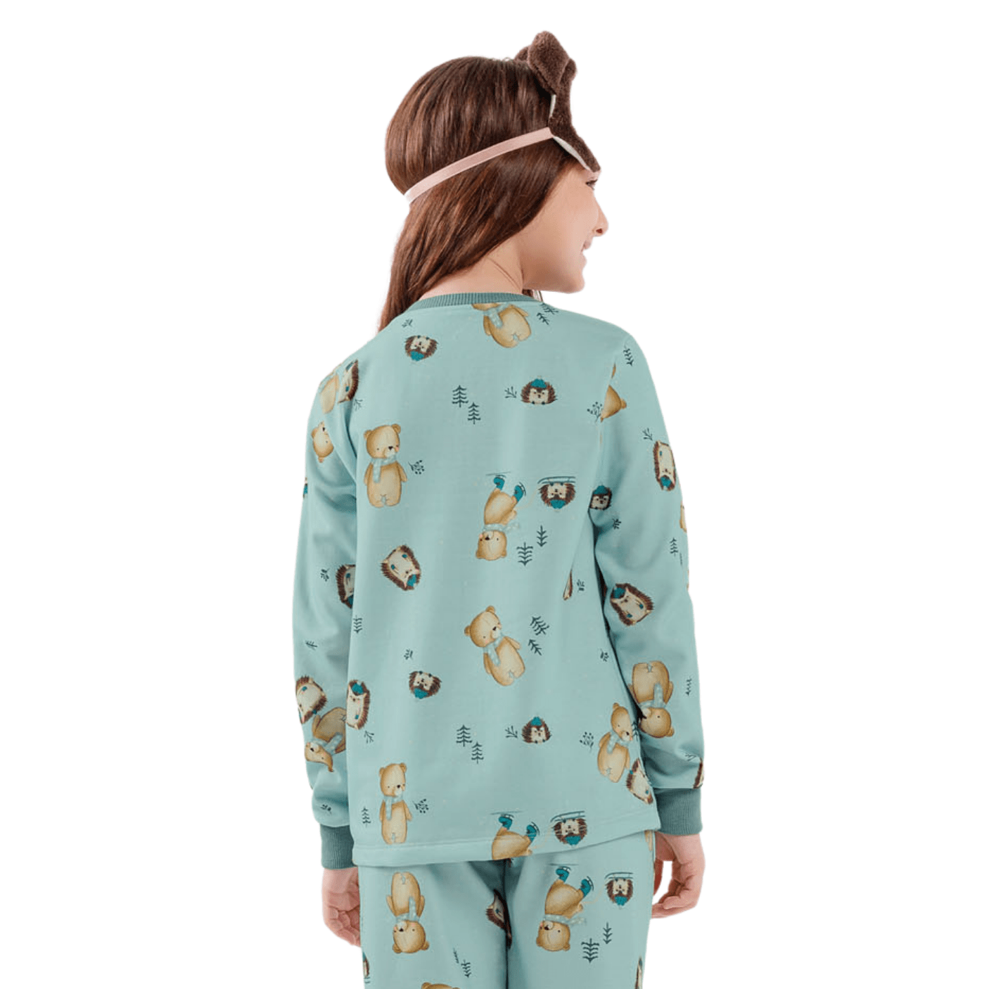 A blusa de manga longa é um verdadeiro encanto! Com uma estampa lúdica de ursinhos e porcos-espinhos brincando na neve, ela traz um ar divertido e acolhedor. Os detalhes em verde escuro na gola e nos punhos proporcionam um contraste sofisticado, adicionando charme ao look.