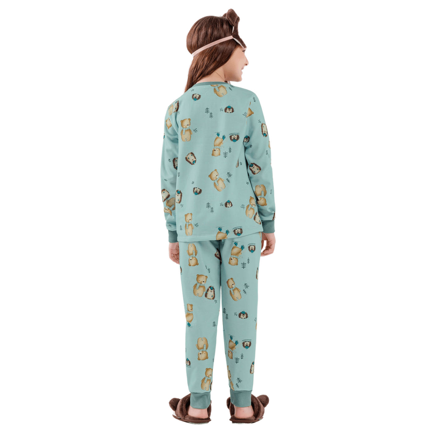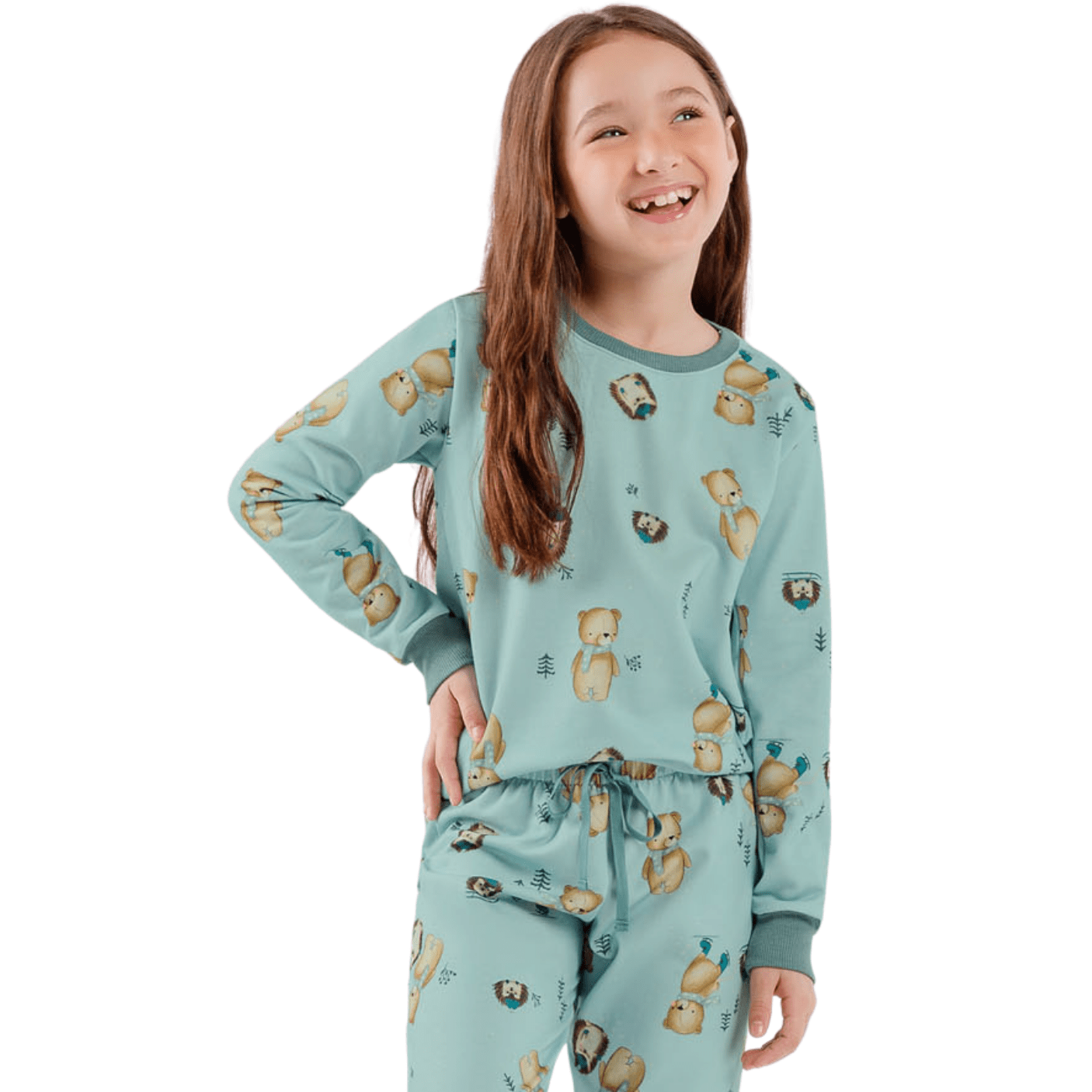 Perfeito para noites de puro aconchego, esse pijama combina conforto e delicadeza em um design encantador. Confeccionado em malha de moletinho com felpa na cor verde, ele oferece um toque macio e quentinho, ideal para os dias mais frios. ❄️