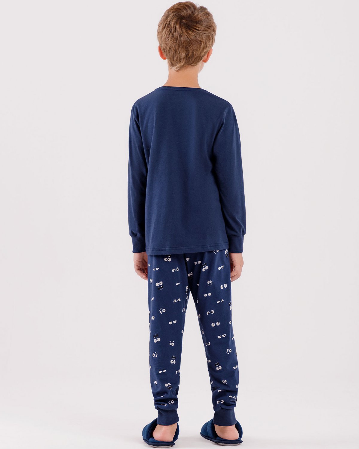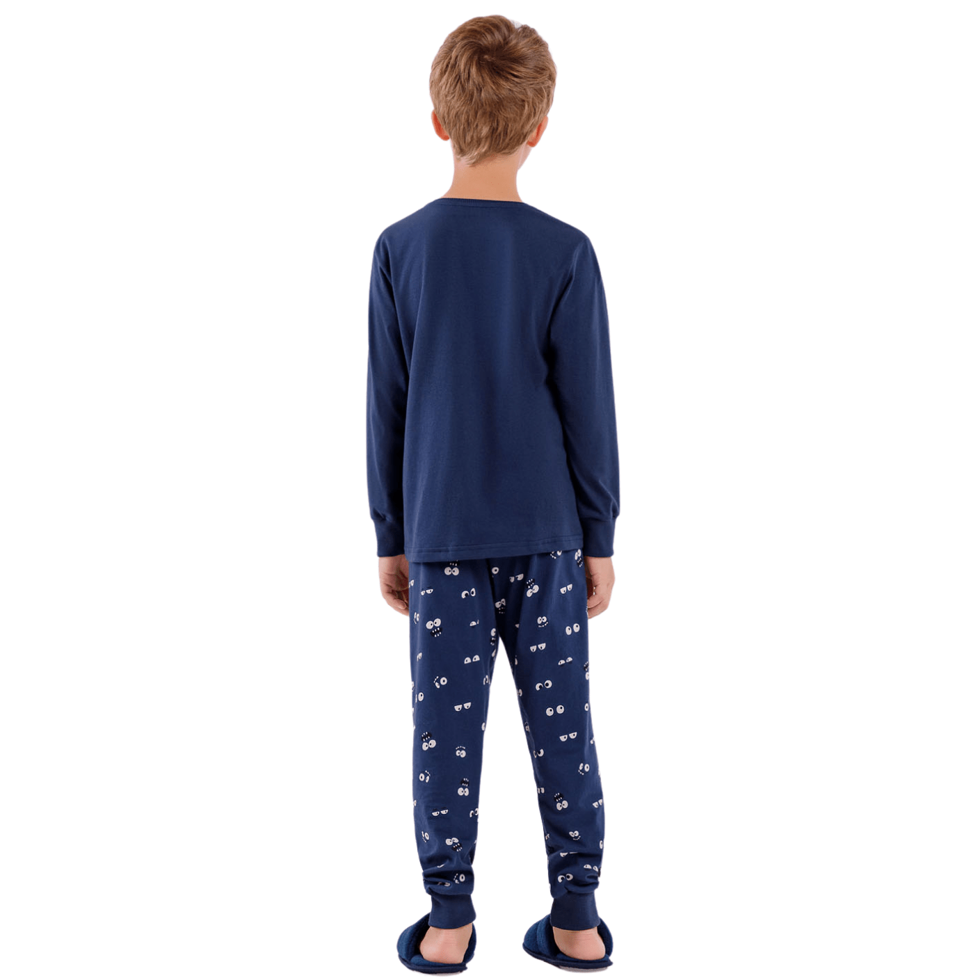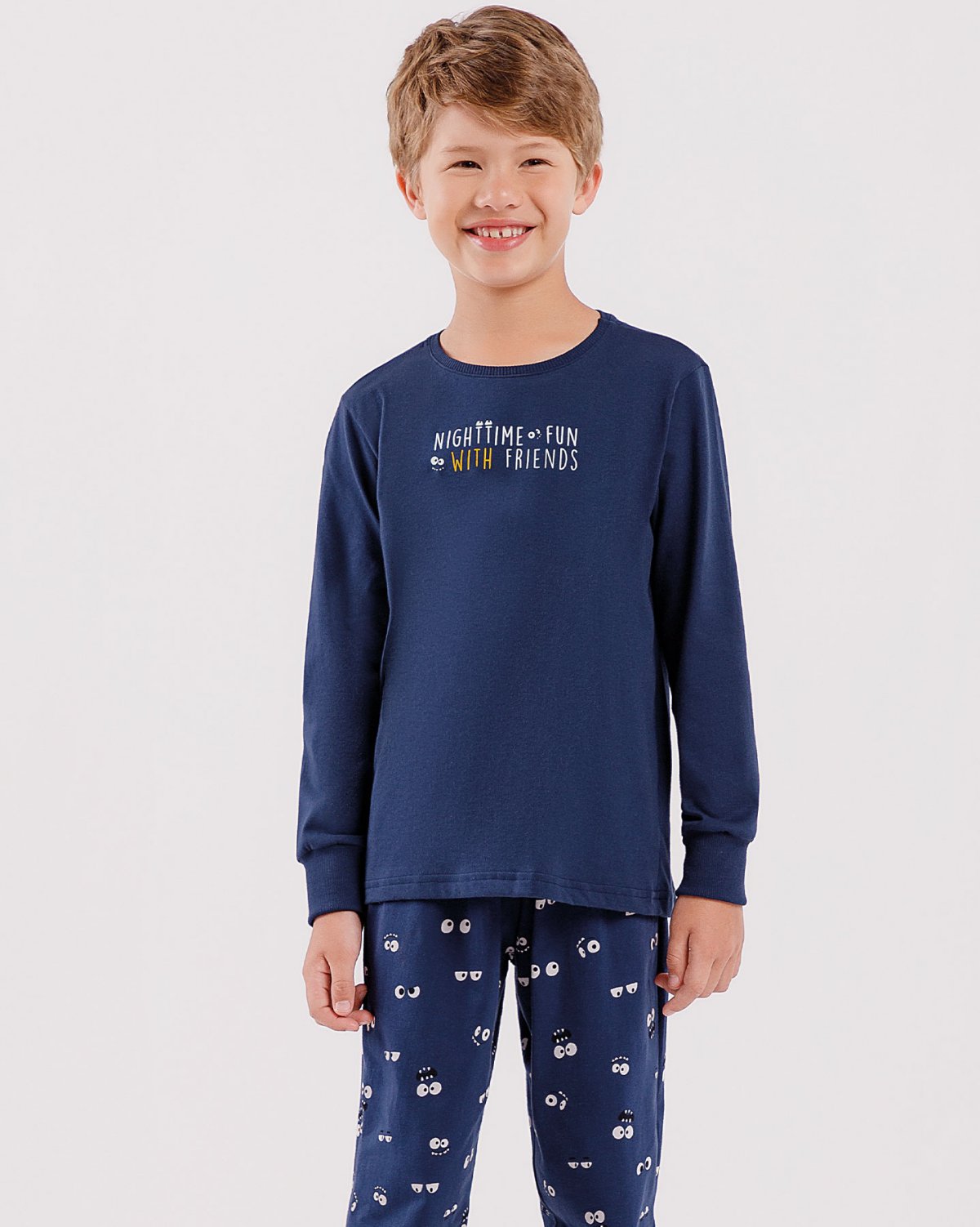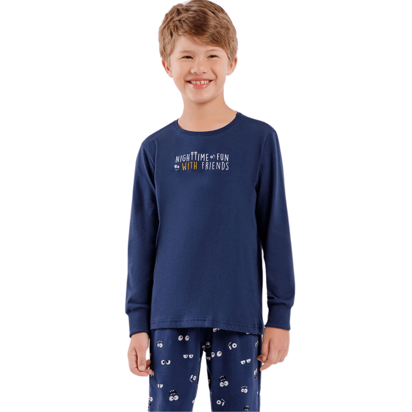 A calça com estampa exclusiva de olhinhos adiciona uma dose de charme e personalidade ao conjunto, enquanto a blusa de manga longa traz uma estampa localizada que brilha no escuro, despertando a imaginação e tornando o momento de vestir o pijama ainda mais especial para os pequenos.