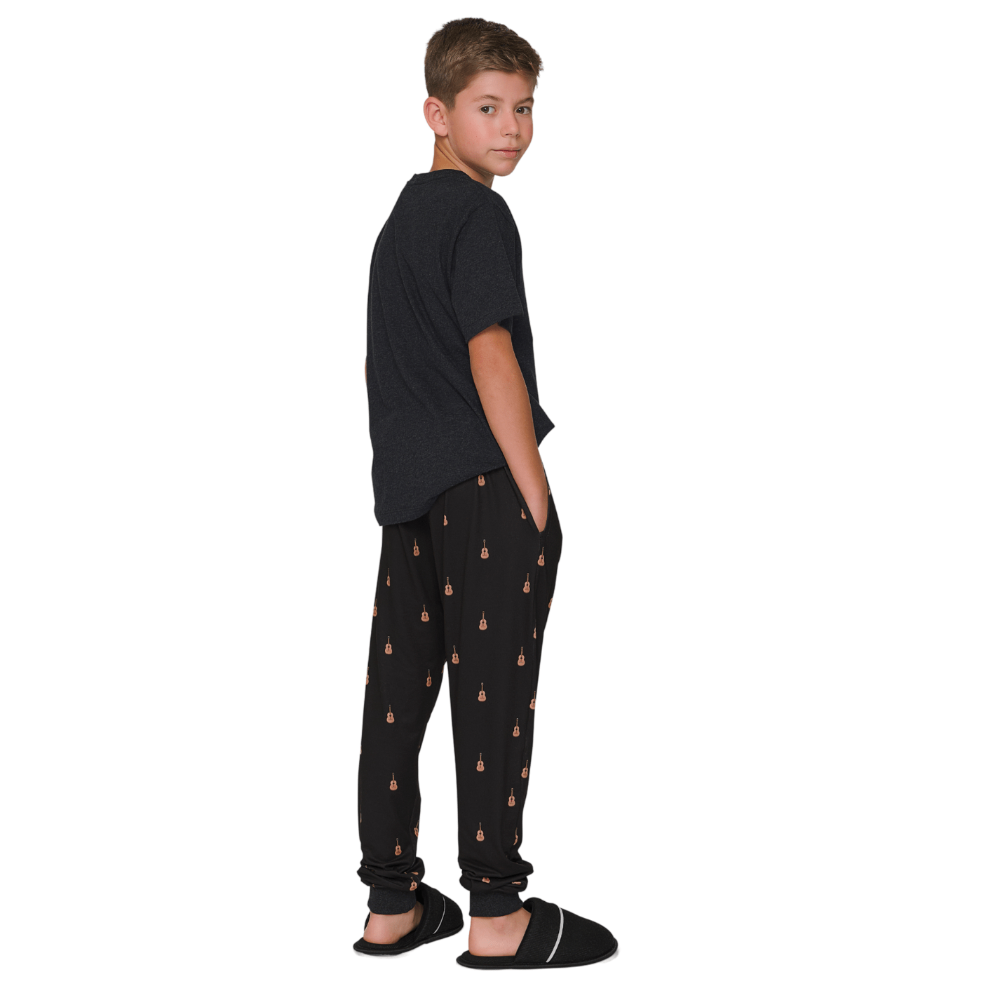 | • Modelo | Pijama Jogger Masculino Infantil de manga curta, Blusa feita em malha melange soft touch com acabamento de gola feito em tecido de ribana, Calça com cós em tecido de ribana, com cordão ajustável. |