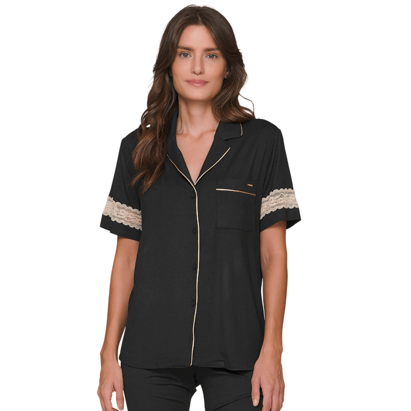 A blusa estilo camisa aberta possui fechamento frontal com botões personalizados, além de bolso aplicado com filete acetinado contrastante, agregando charme e acabamento refinado. O toque de exclusividade vem com os recortes vazados em renda contrastante nas mangas curtas, que elevam o visual.