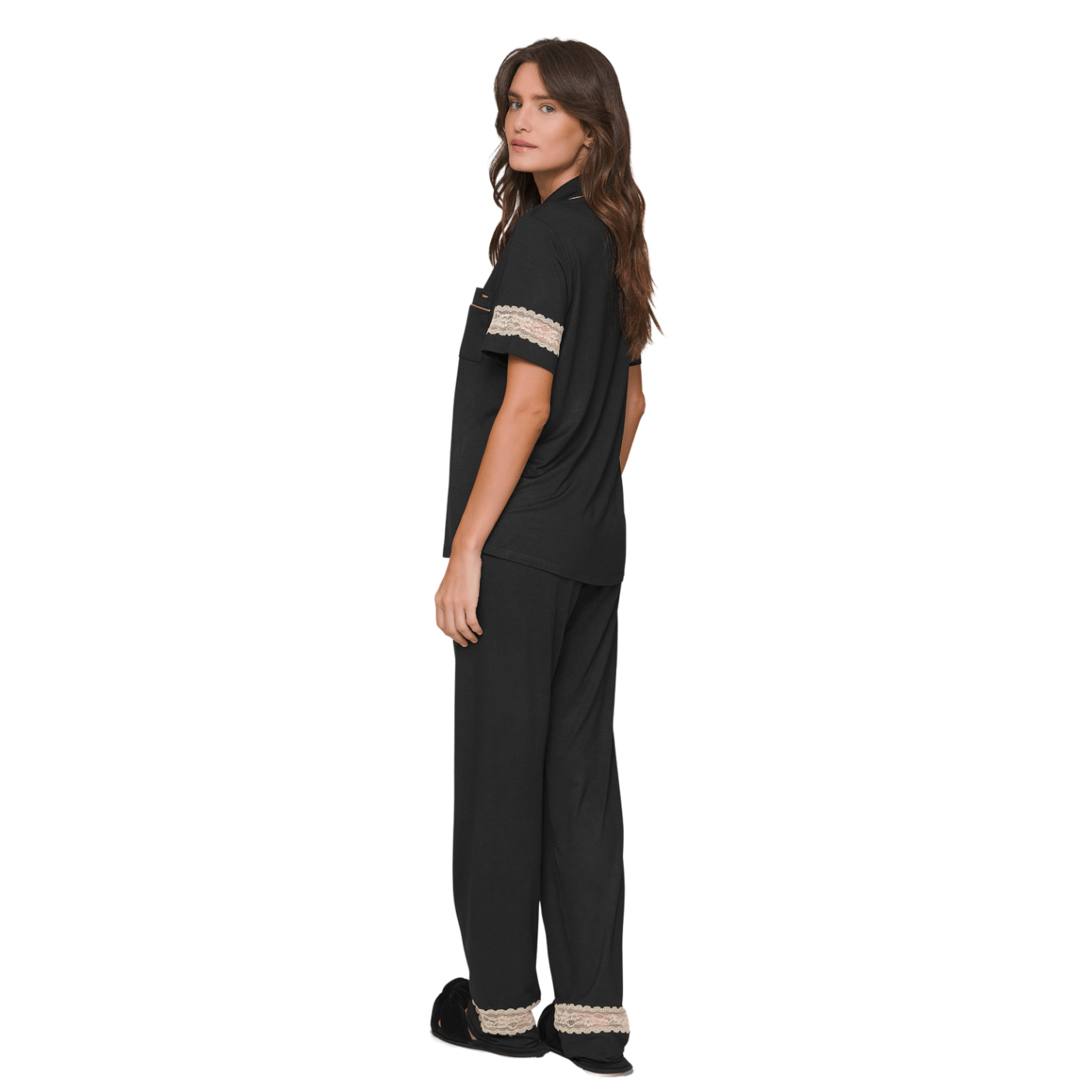 A calça reta com elástico na cintura garante um ajuste confortável, enquanto a renda aplicada na barra completa o visual com delicadeza e feminilidade. Um pijama feminino elegante e atemporal, ideal para quem valoriza o equilíbrio entre estilo e bem-estar.