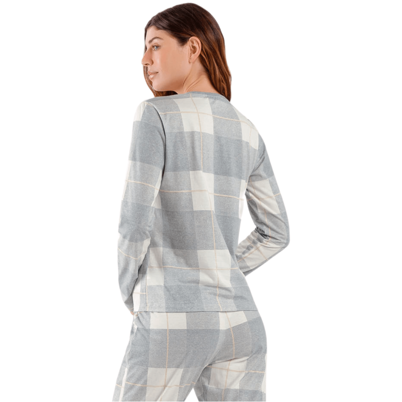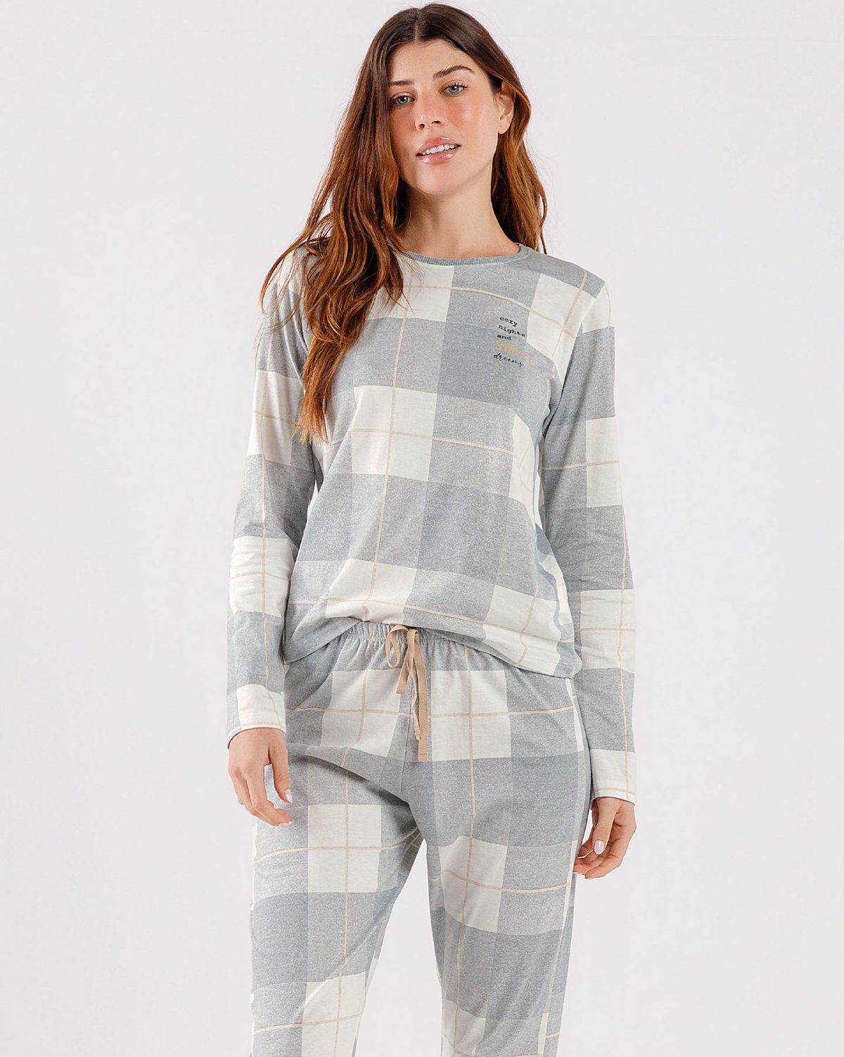 A calça com punho traz uma estampa xadrez em cores discretas, que transmite elegância com um toque casual. Para harmonizar perfeitamente, o amarrador na cintura repete os tons da estampa localizada na blusa, criando uma composição equilibrada, pensada em cada detalhe para realçar a feminilidade e o bom gosto.