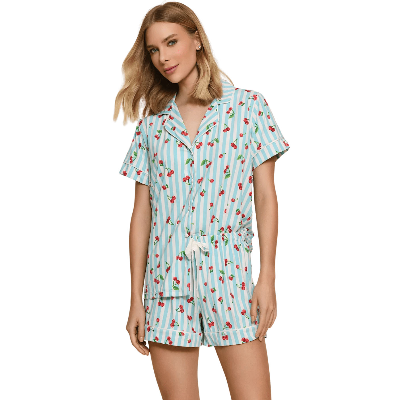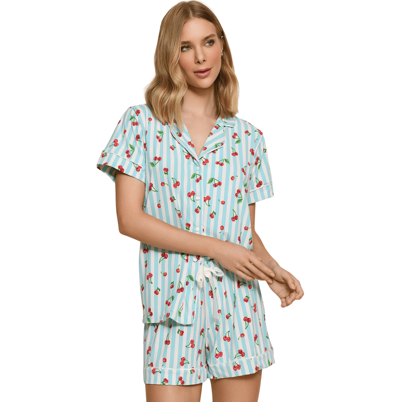 Feito em tecido leve, com caimento soltinho e estampa de cerejinhas sobre listras azul bebê, ele traz aquele mood delicado e divertido que só a Miss Victtoria oferece.