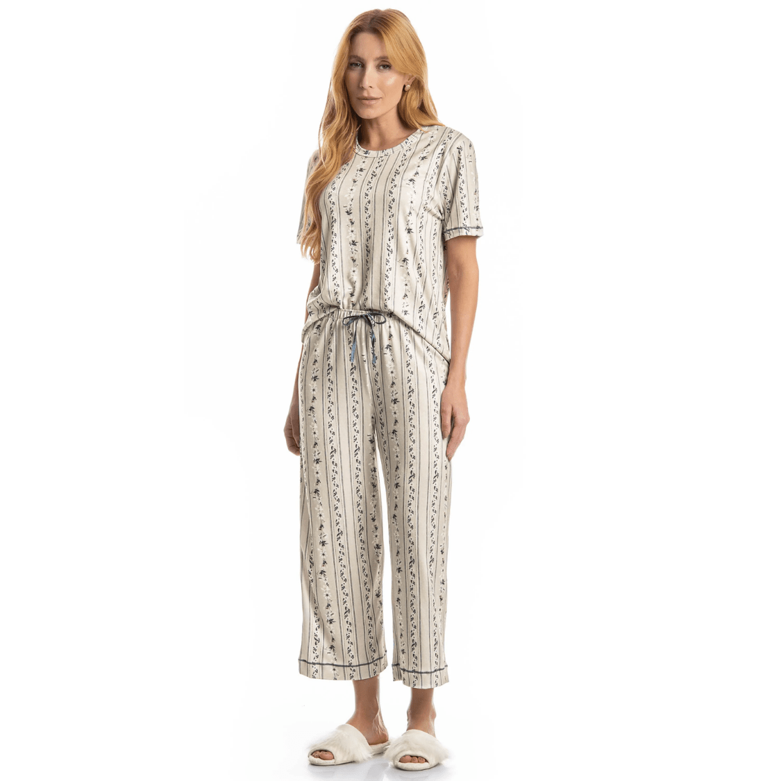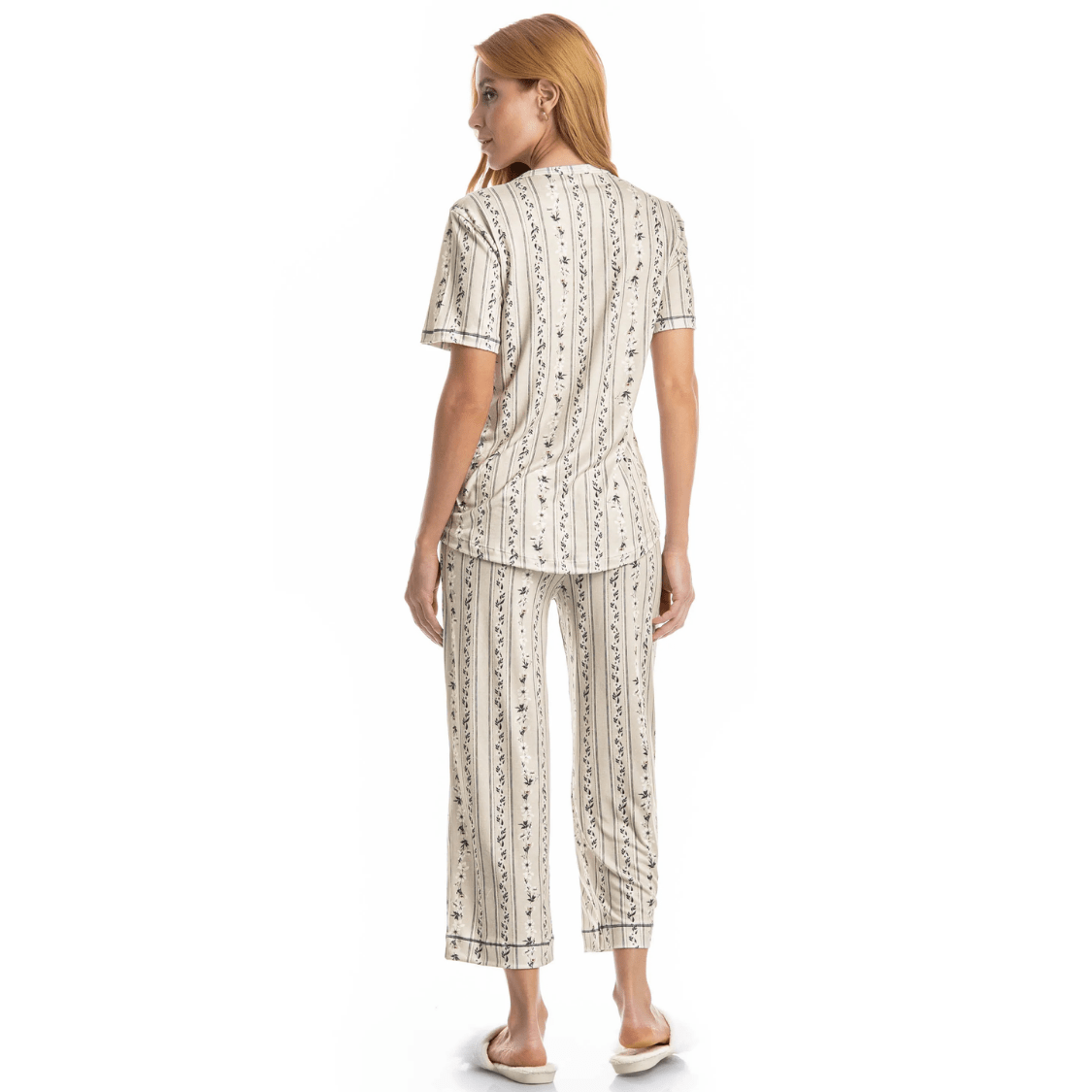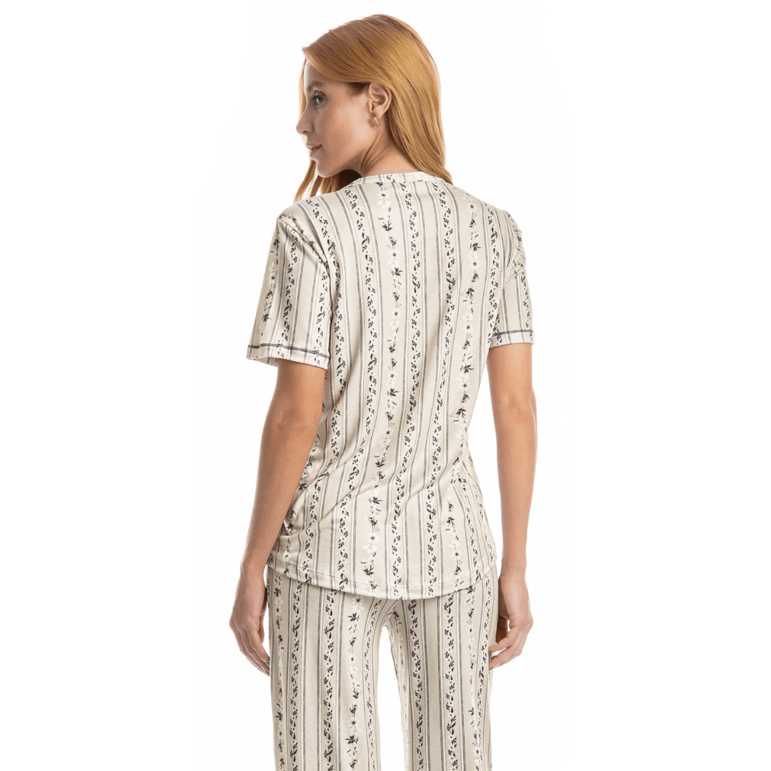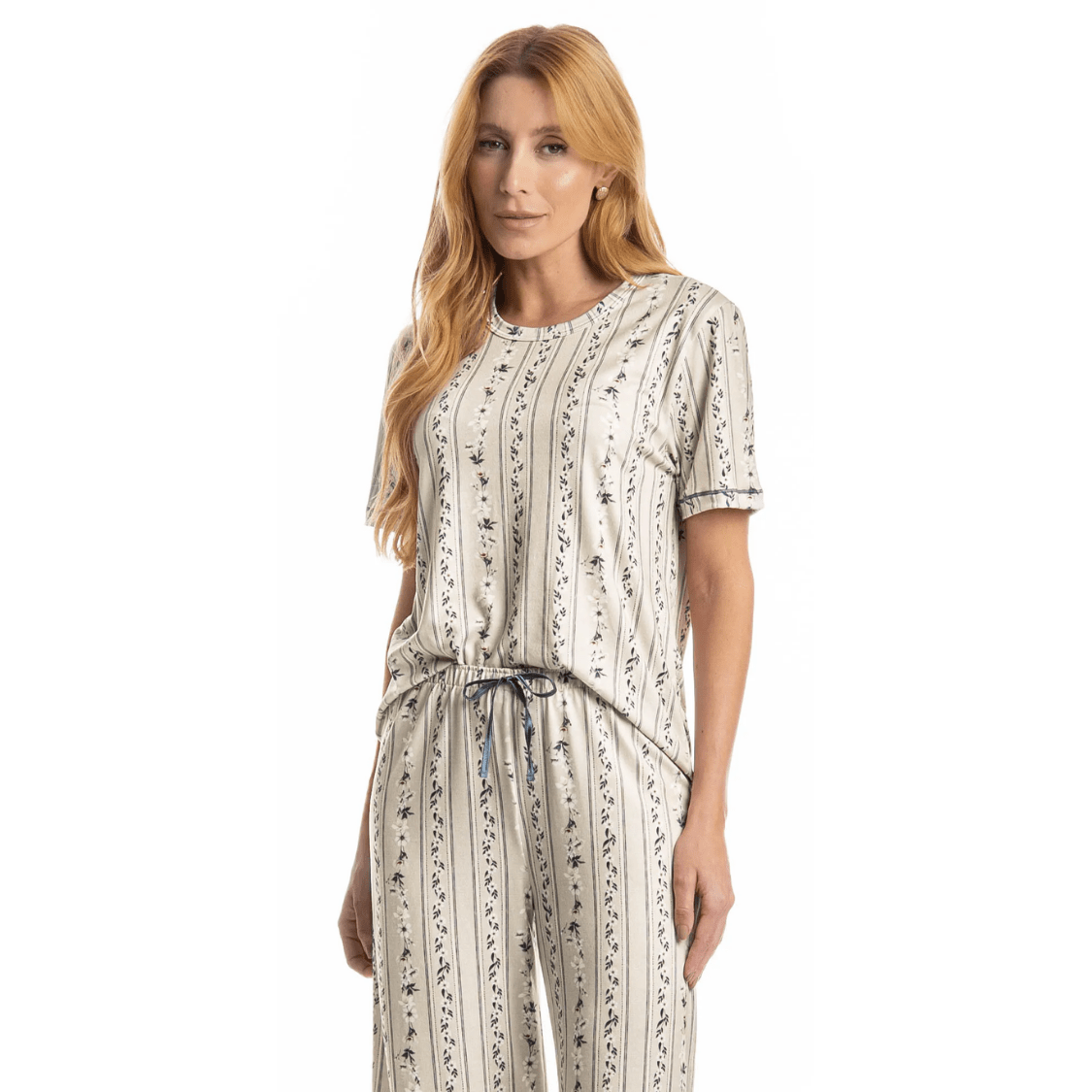 A blusa de manga curta possui modelagem soltinha, enquanto a calça modelo capri conta com comprimento mais curto, ideal para dias mais amenos ou temperaturas mais quentes.