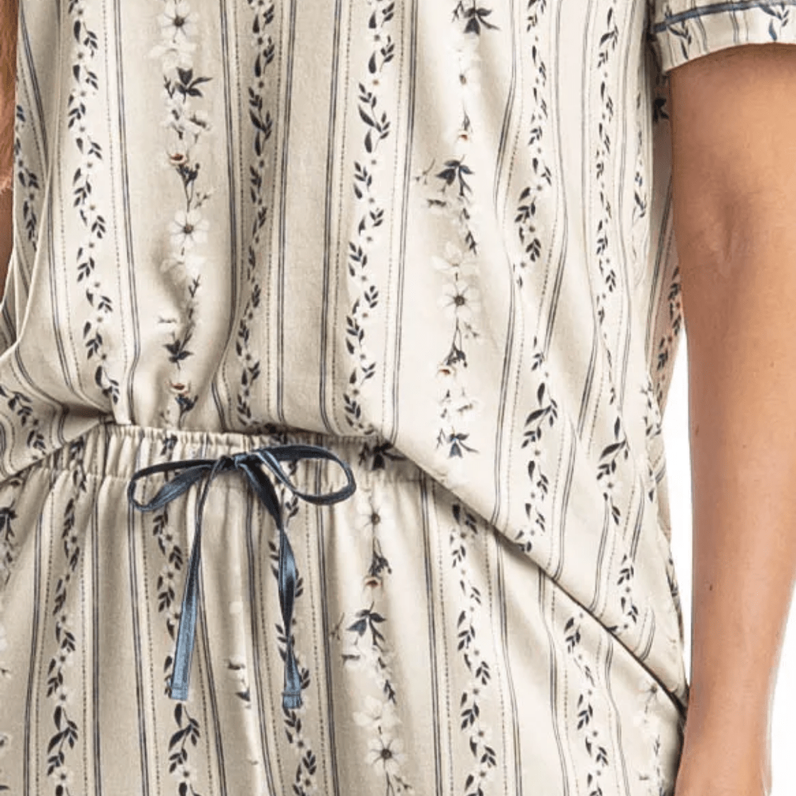 Com um design feminino e sofisticado, o conjunto se destaca pela estampa floral delicada, que traz um visual leve, romântico e atemporal. A combinação de tons suaves reforça a elegância da peça.
