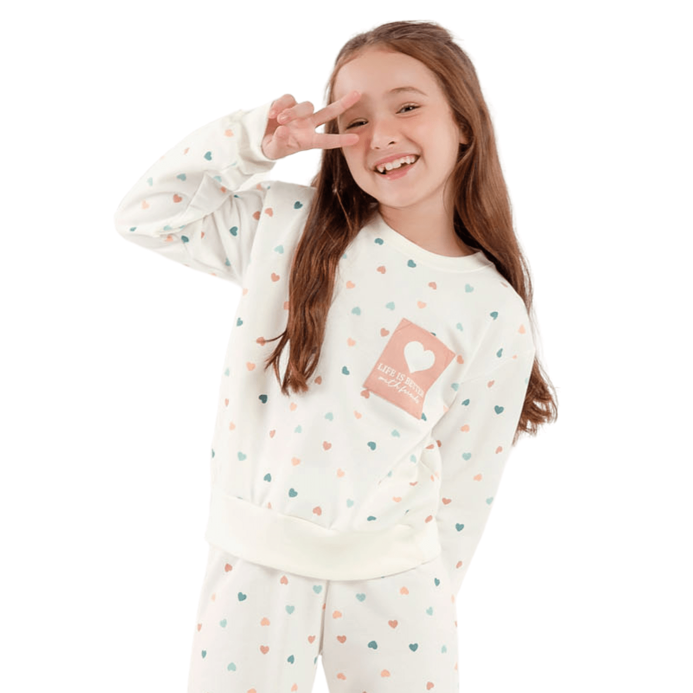 A peça traz uma estampa suave de corações em tons delicados, criando um visual romântico e acolhedor. O charme fica por conta do bolso estampado com a frase “A vida é melhor com amigos”, um detalhe especial que adiciona significado à peça. Os punhos nas mangas e na barra da calça completam o visual com um acabamento moderno e funcional, garantindo melhor ajuste e ainda mais conforto.