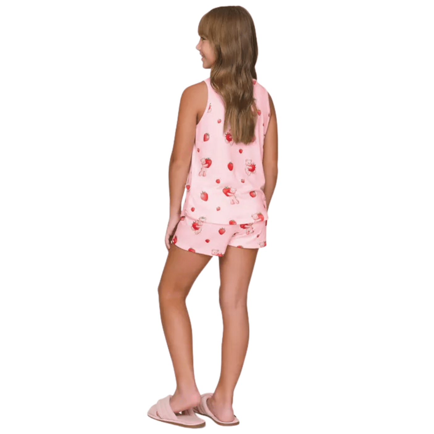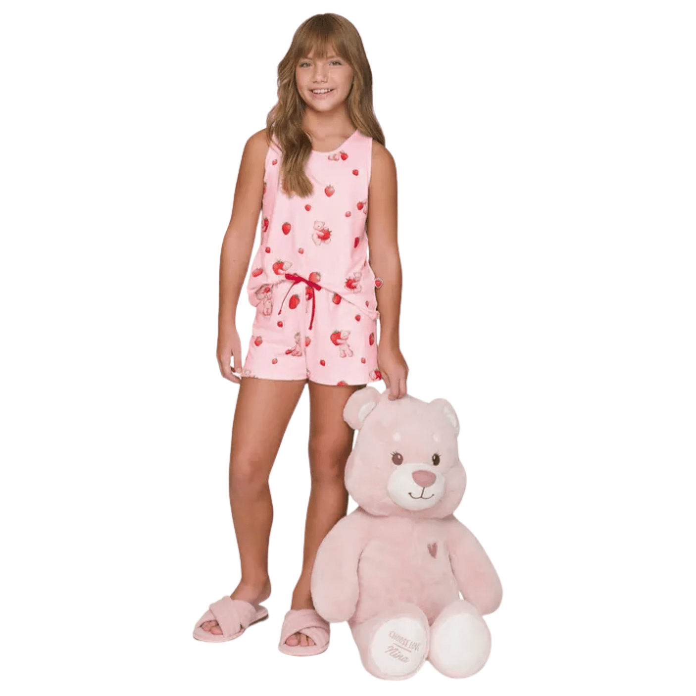 A encantadora Nina chega em um pijama infantil cheio de charme e diversão, trazendo sua paixão pelo morango como destaque especial. Confeccionado em Sublime Touch, a malha exclusiva Lua Luá com toque pele de pêssego e caimento suave, o conjunto é leve, confortável e ideal para noites de descanso mais aconchegantes. A regata possui decote redondo e estampa exclusiva da personagem, transmitindo delicadeza e fofura. O short, também em Sublime Touch, conta com cordão contrastante para melhor ajuste e conforto. O detalhe final fica por conta da etiqueta especial em formato de morango, aplicada na lateral da peça, que torna esse pijama ainda mais único e apaixonante.