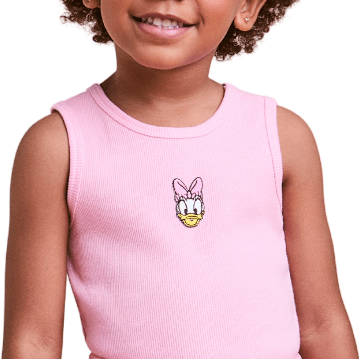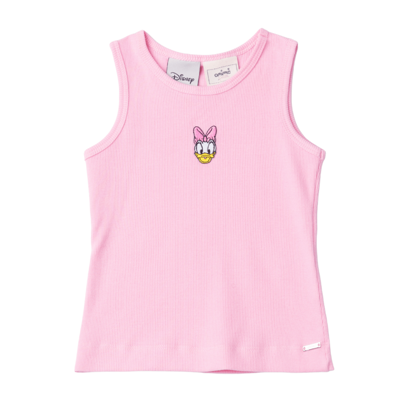 Com modelagem regata clássica, decote arredondado e acabamento impecável, é uma peça versátil que se adapta a diferentes produções. O grande destaque está no bordado frontal da Daisy, com suas cores delicadas e o icônico laço rosa, que adicionam personalidade e um toque lúdico ao visual. O tom rosa suave deixa o look ainda mais feminino, alegre e cheio de charme.
