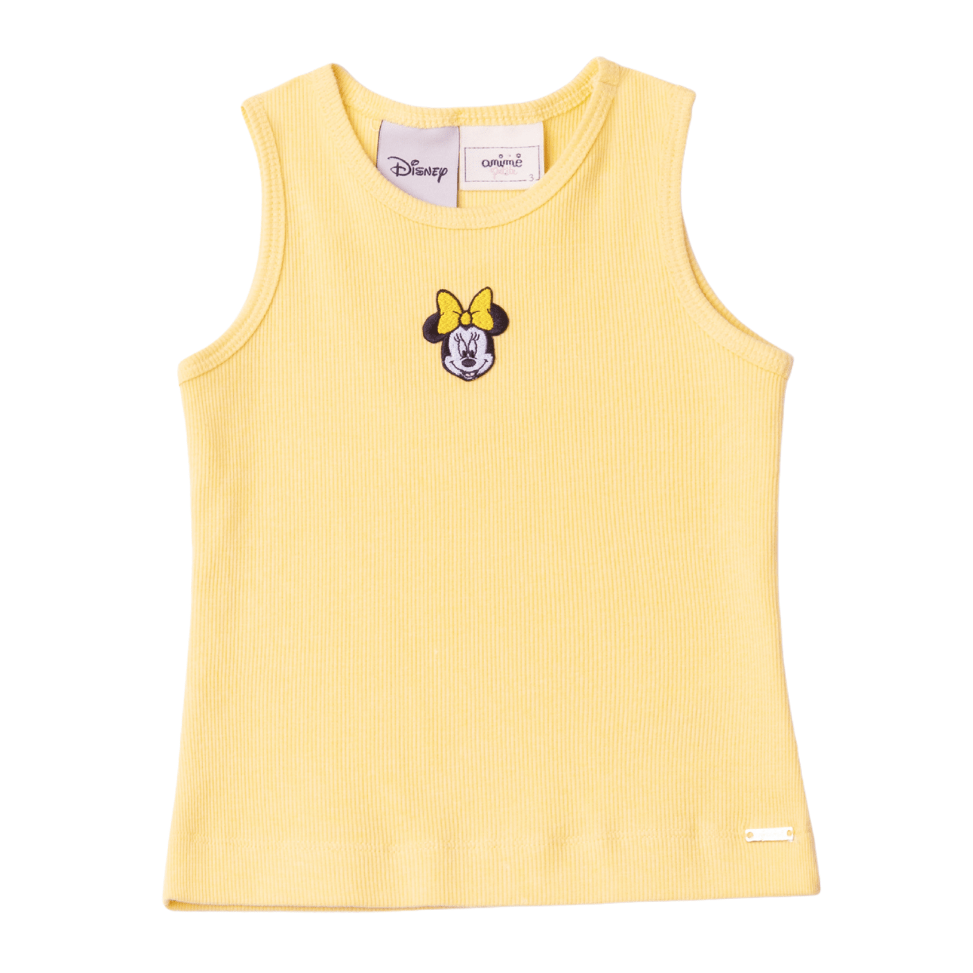 Com modelagem clássica e decote arredondado, a regata é versátil e fácil de combinar com diferentes peças. O destaque fica por conta do bordado da Minnie na parte frontal, com o icônico laço amarelo que combina com o tom vibrante da peça, deixando o visual divertido, moderno e cheio de personalidade.