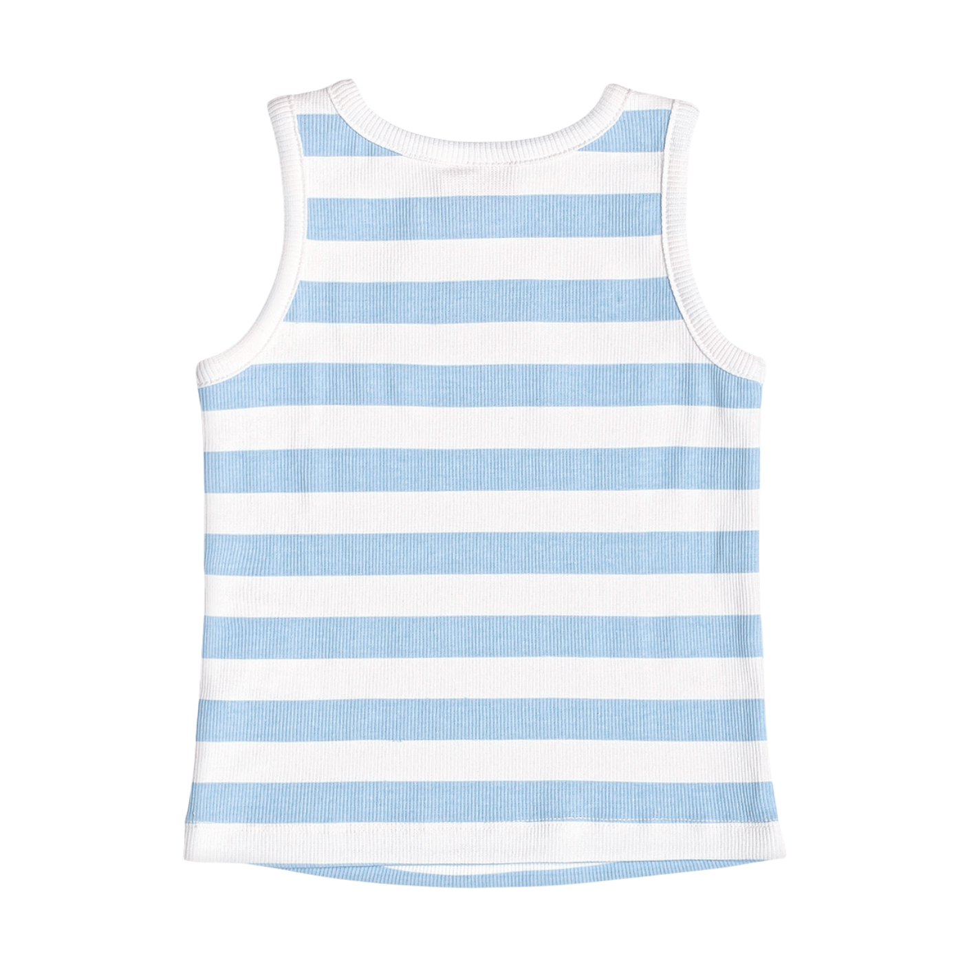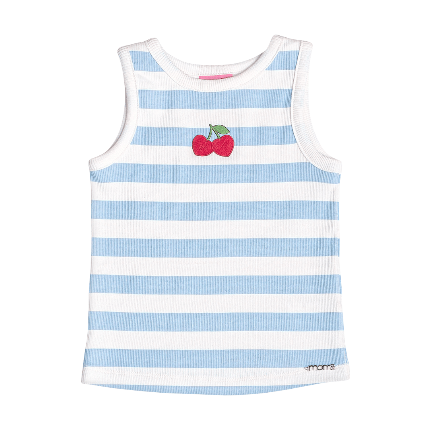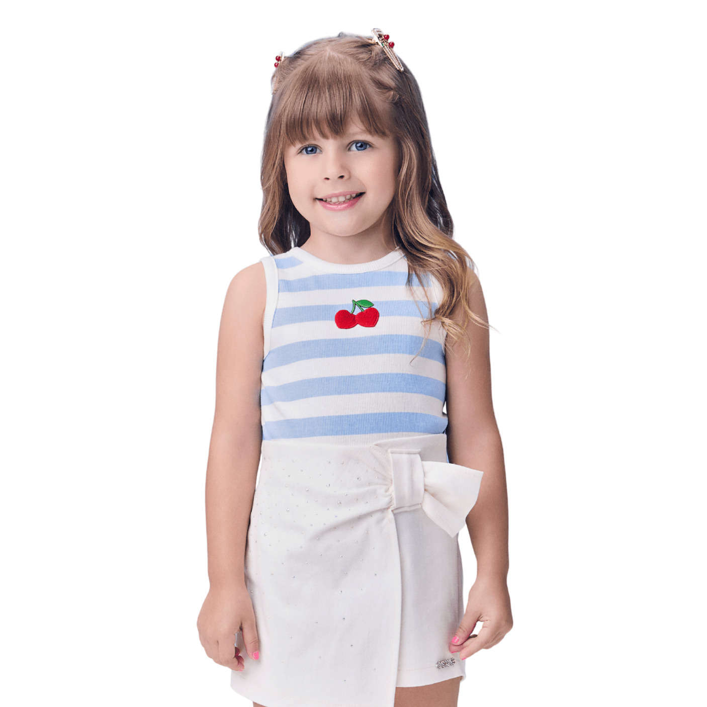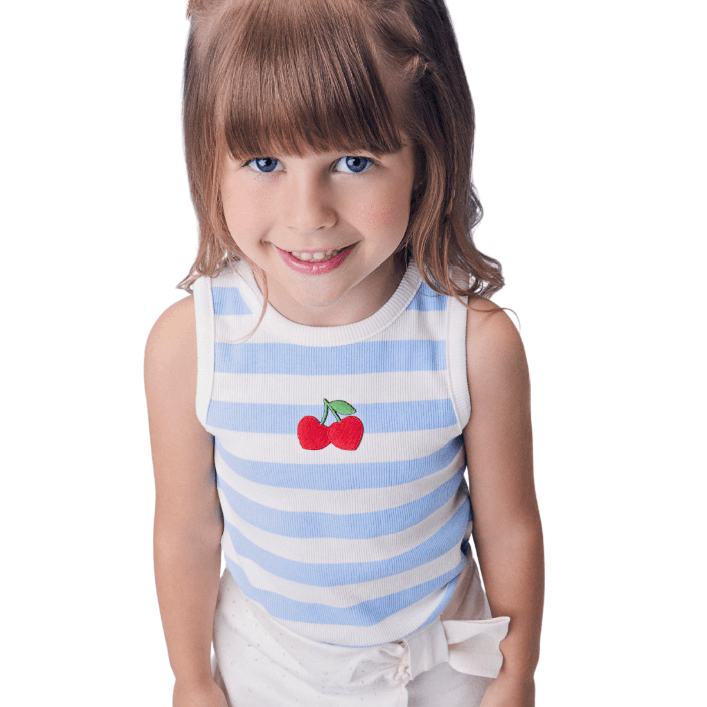 Com estampa listrada azul e branca, a regata traz um toque navy repaginado, enquanto o patch bordado de cerejinha adiciona um ar divertido e delicado à composição — uma marca registrada do estilo alegre e encantador da Momi.