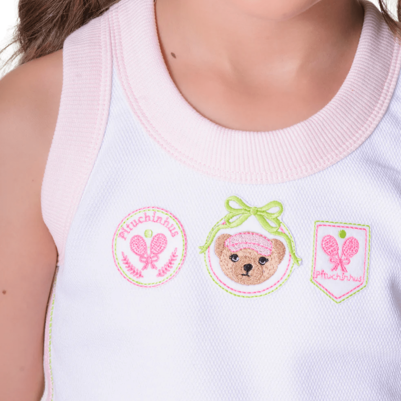 A Regata Malha Piquet Patches Ursinha Pituchinhus é uma peça encantadora que combina o toque esportivo do tecido piquet com a doçura dos detalhes exclusivos da marca.