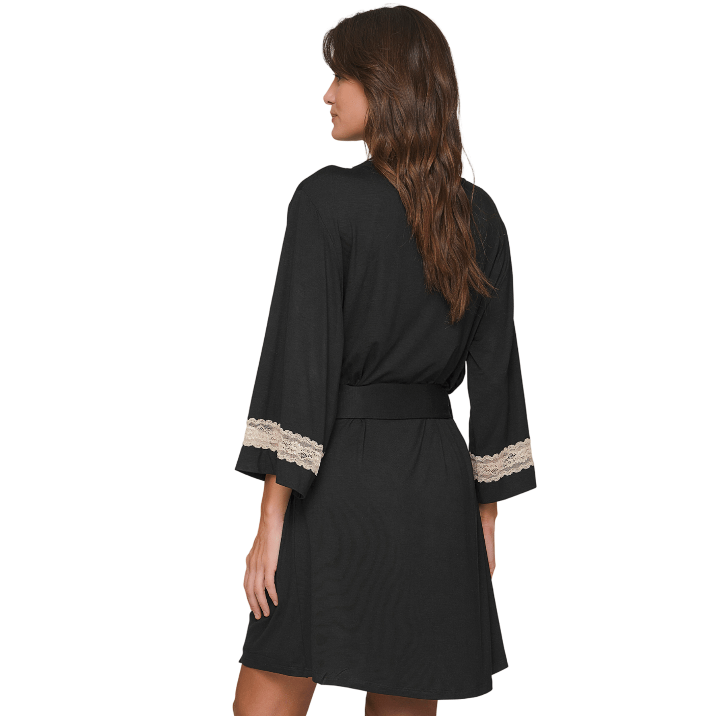 Sua modelagem ampla valoriza diferentes silhuetas, enquanto as mangas 7/8 com punho e os delicados recortes em renda contrastante trazem sofisticação na medida certa. O detalhe do filete acetinado na parte frontal confere um acabamento refinado, e a faixa na cintura permite um ajuste delicado, realçando a feminilidade com elegância.
