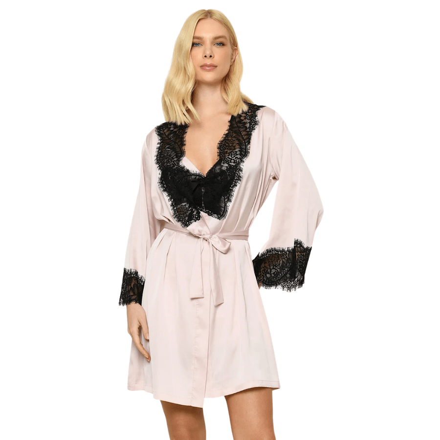 O destaque fica por conta dos detalhes em renda preta no decote e nos punhos, que trazem um toque sofisticado e romântico à peça. O cinto para amarração na cintura permite um ajuste perfeito, valorizando a silhueta.