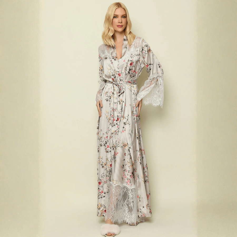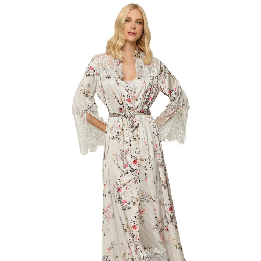 A modelagem longa e fluida valoriza a silhueta, enquanto os detalhes em renda nas mangas e na barra acrescentam um toque refinado e delicado. A faixa para amarração na cintura permite ajuste perfeito, garantindo conforto e elegância.