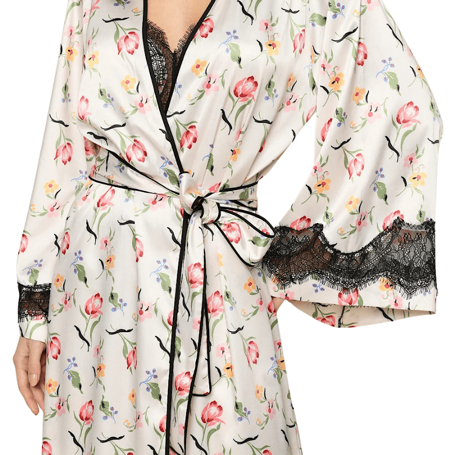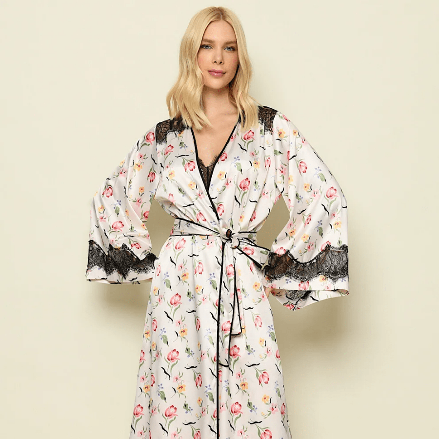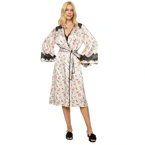 A modelagem midi proporciona caimento leve e fluido, enquanto os detalhes em renda preta nas mangas e no acabamento do decote acrescentam um toque refinado à peça. A faixa para amarração na cintura permite ajuste perfeito, valorizando a silhueta com conforto e delicadeza.