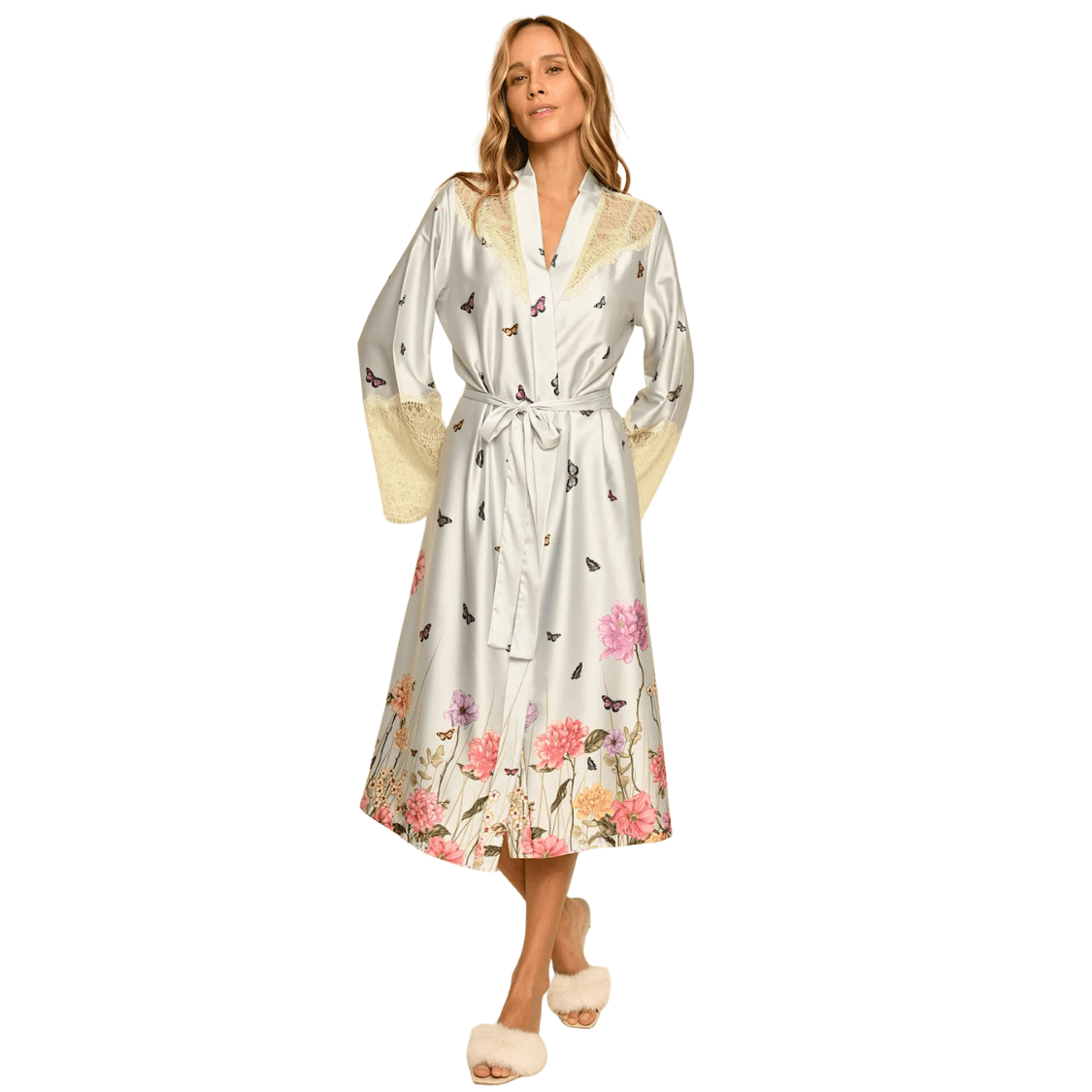 Confeccionado em tecido leve e fluido, o robe proporciona um caimento suave e confortável sobre o corpo. Os detalhes em renda nas mangas e gola elevam a peça com feminilidade e sofisticação.