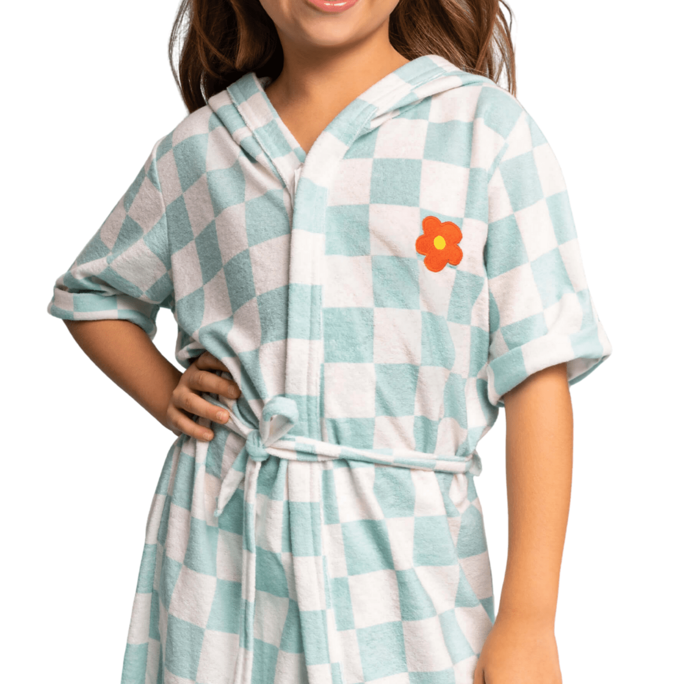 O design moderno com estampa quadriculada verde água transmite frescor e alegria, enquanto o bordado da flor colorida adiciona um toque divertido e delicado. O modelo com capuz e cinto para amarração oferece praticidade e segurança, ideal para usar após o banho, na praia ou na piscina.