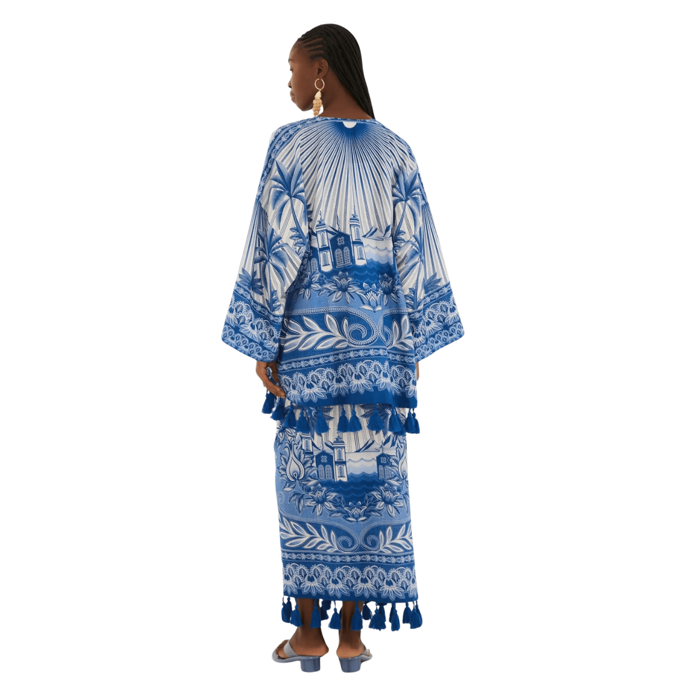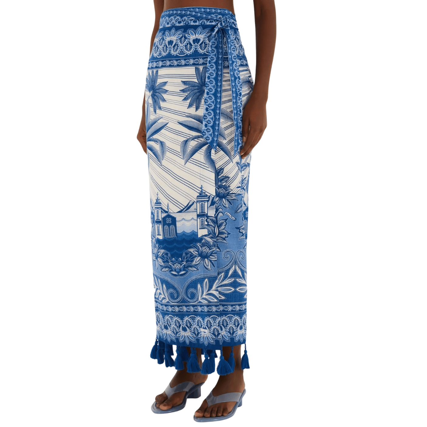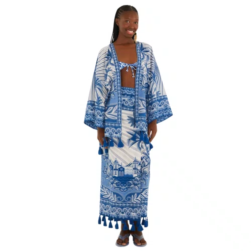 O design com cintura alta valoriza a silhueta, enquanto o abotoamento frontal adiciona praticidade e charme. A estampa Afeto Tropical em azul e branco traz elementos botânicos e tropicais combinados a detalhes gráficos inspirados na brasilidade, reforçando a identidade criativa da Farm Rio. O acabamento delicado nas bainhas, aliado às franjas aplicadas na barra, completa o visual com um toque artesanal e exclusivo.