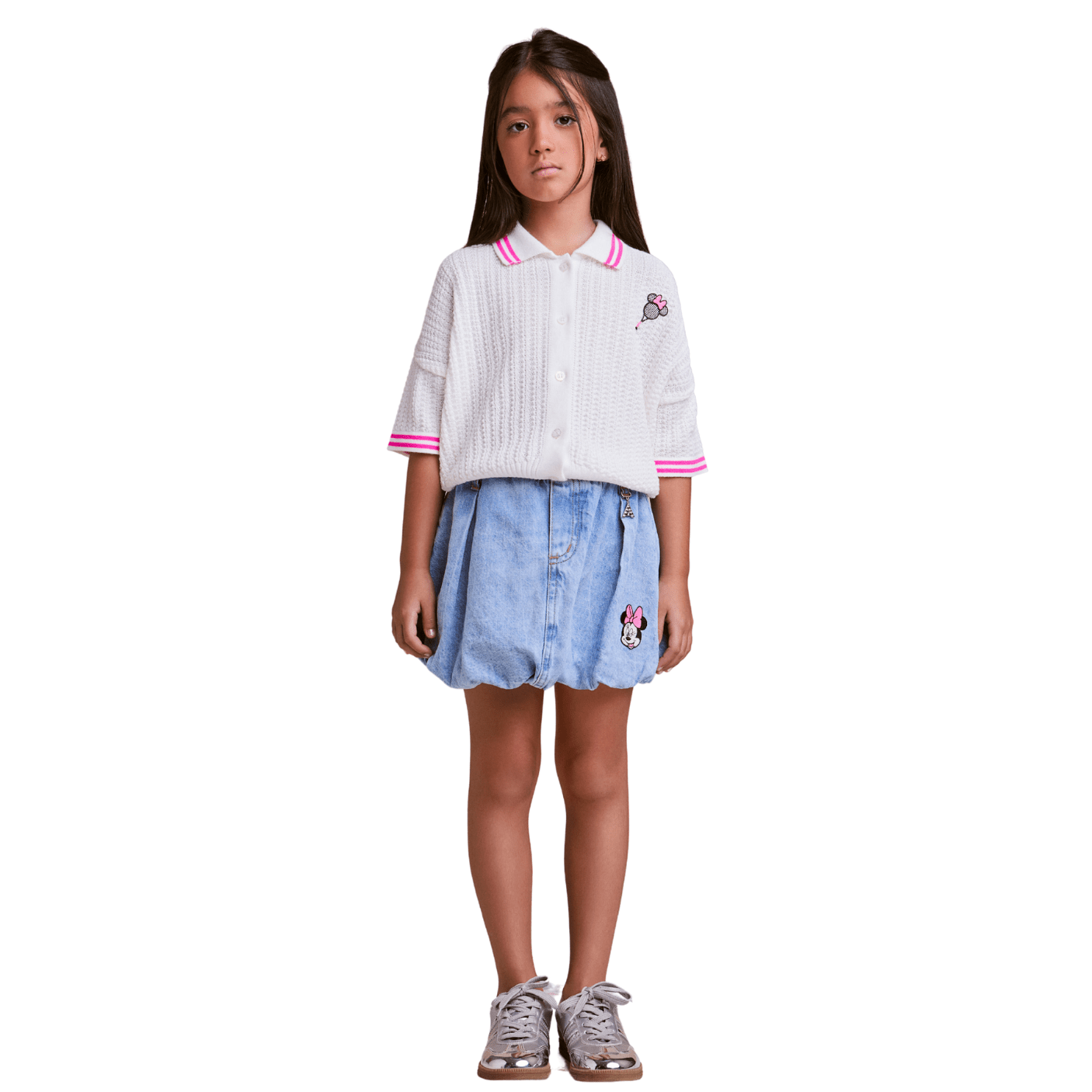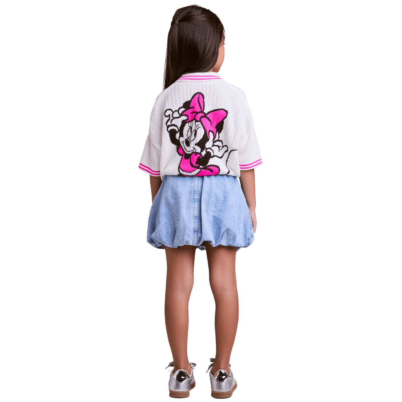 A Saia Jeans Minnie Balonê da Animê traz um mix de estilo moderno e diversão com o charme clássico da personagem mais querida da Disney. Produzida em jeans leve e confortável, possui modelagem balonê que garante um caimento fofo e volumoso, proporcionando movimento e delicadeza ao visual.
