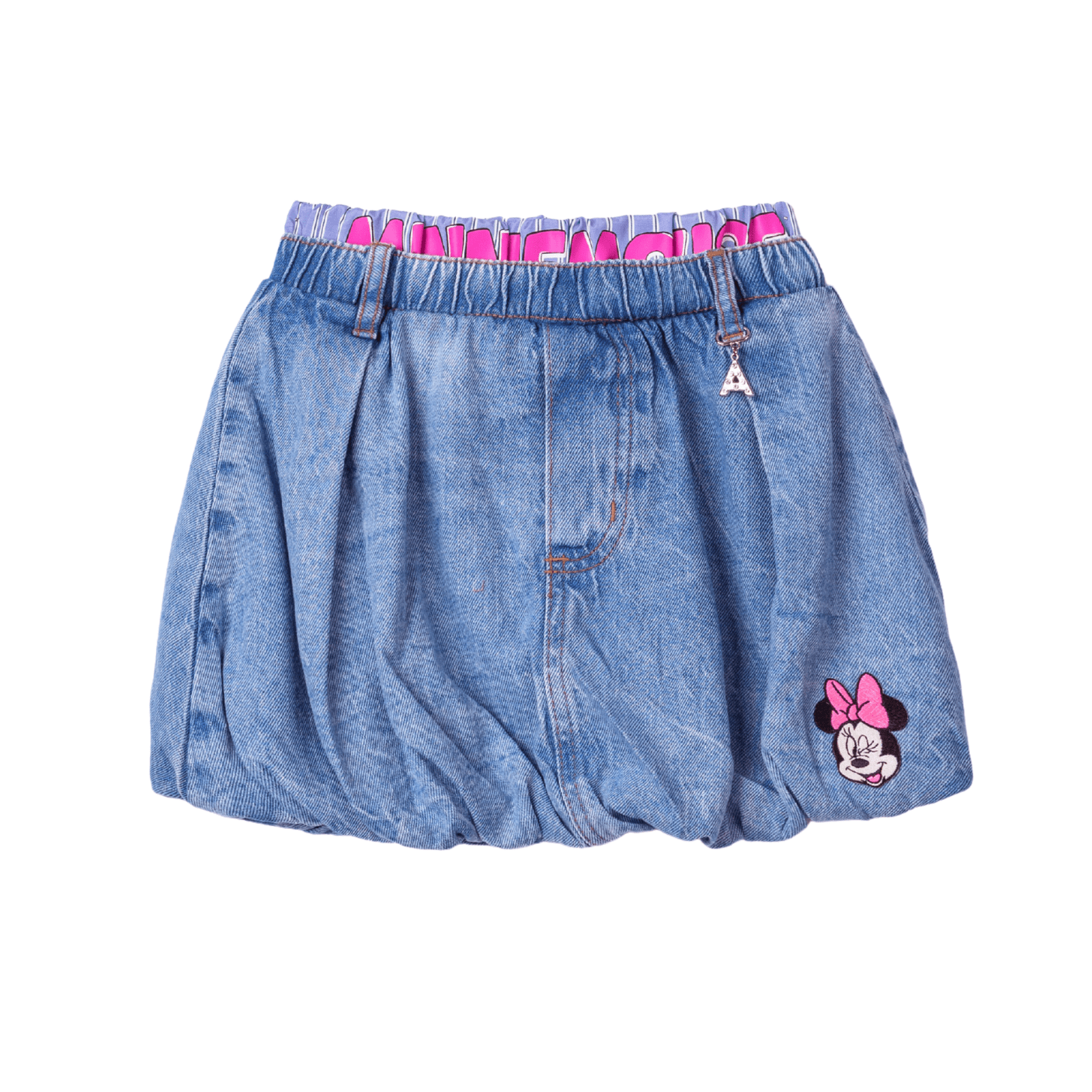 A cintura é toda em elástico, com escrita estilizada da marca em tom rosa, oferecendo ajuste perfeito e um toque fashion. Na parte frontal, o detalhe da Minnie bordada no canto adiciona personalidade e delicadeza à peça. Além disso, conta com pequenos passantes para cinto e pingente decorativo metalizado em formato de letra “A”, característico da marca Animê.