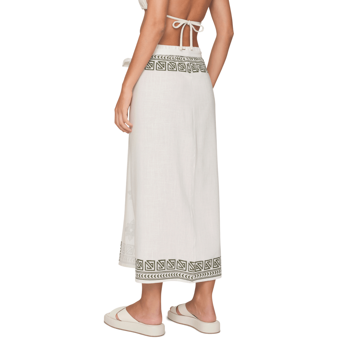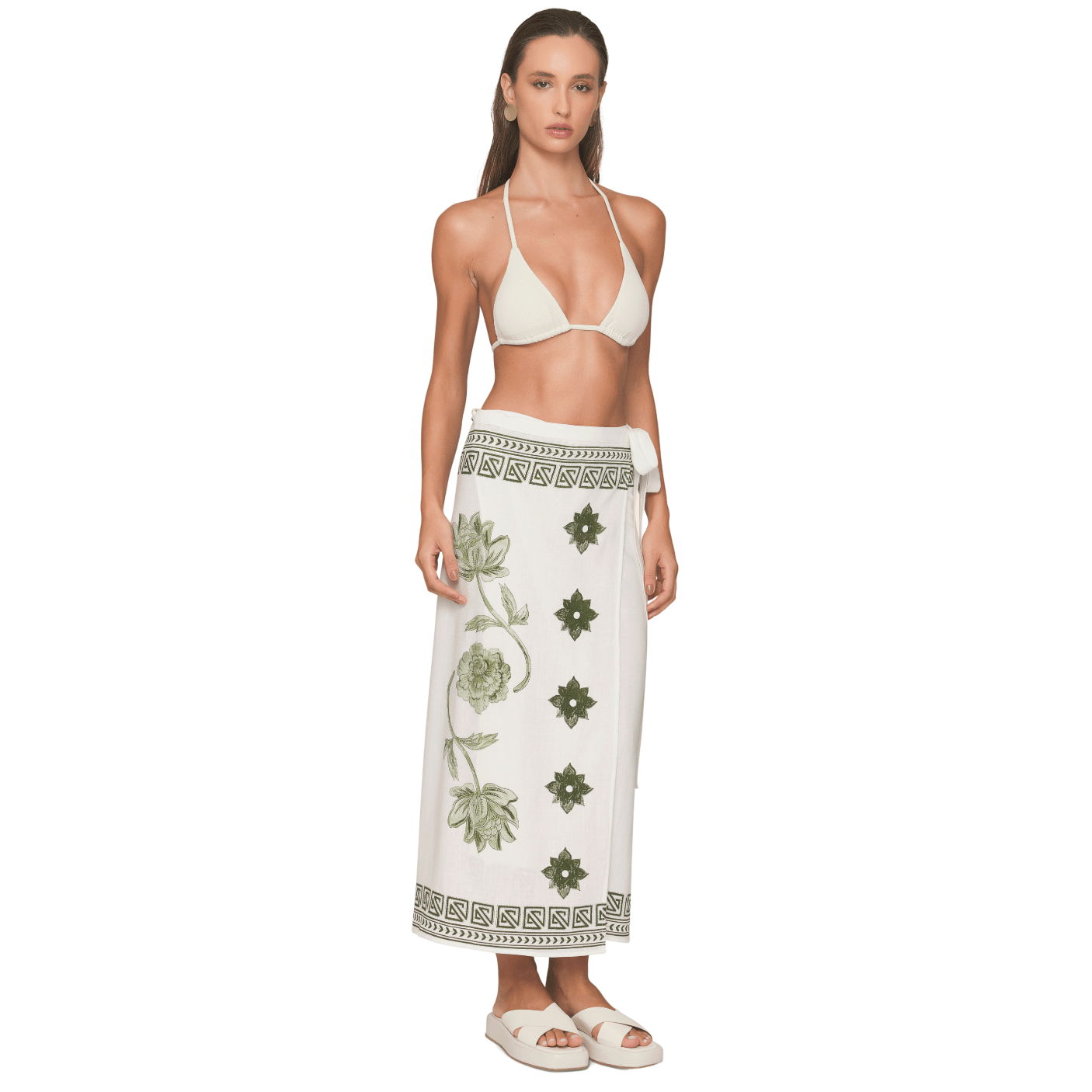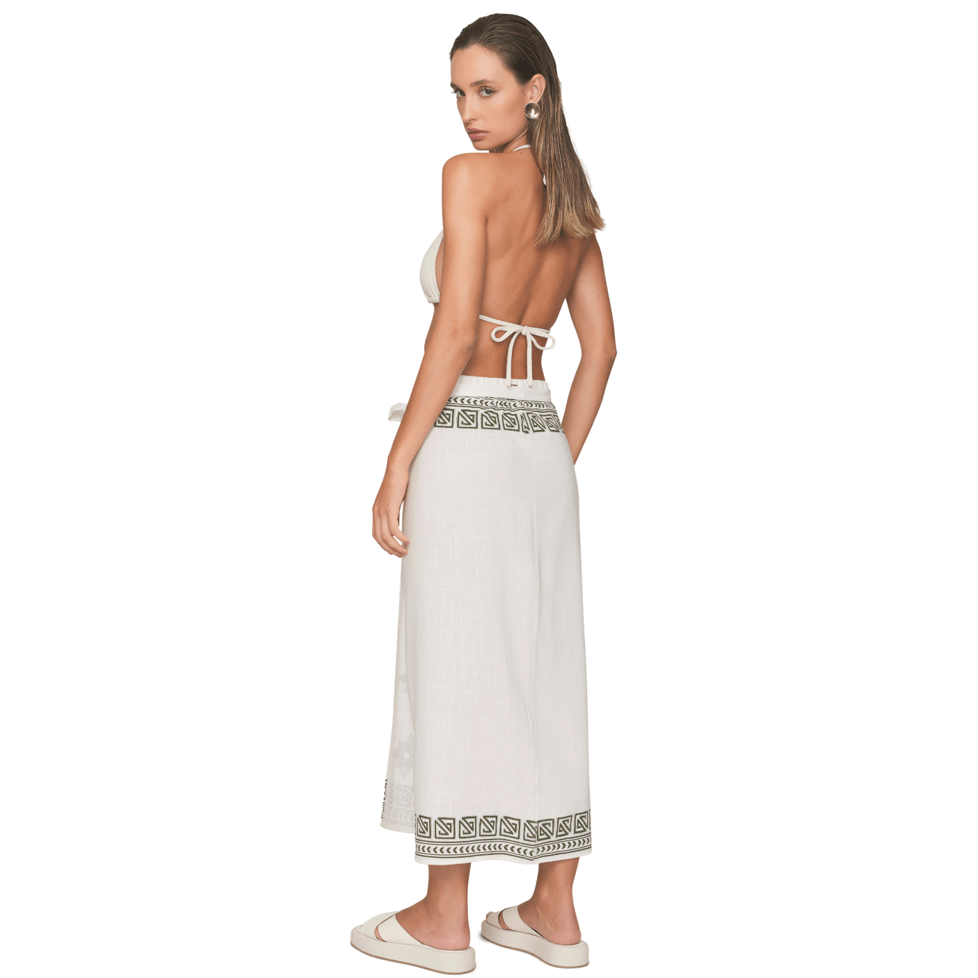 O comprimento longo e a modelagem reta alongam a silhueta, tornando a saia versátil para diversas ocasiões — desde produções de praia com biquíni e rasteirinha até looks urbanos com top e sandálias.